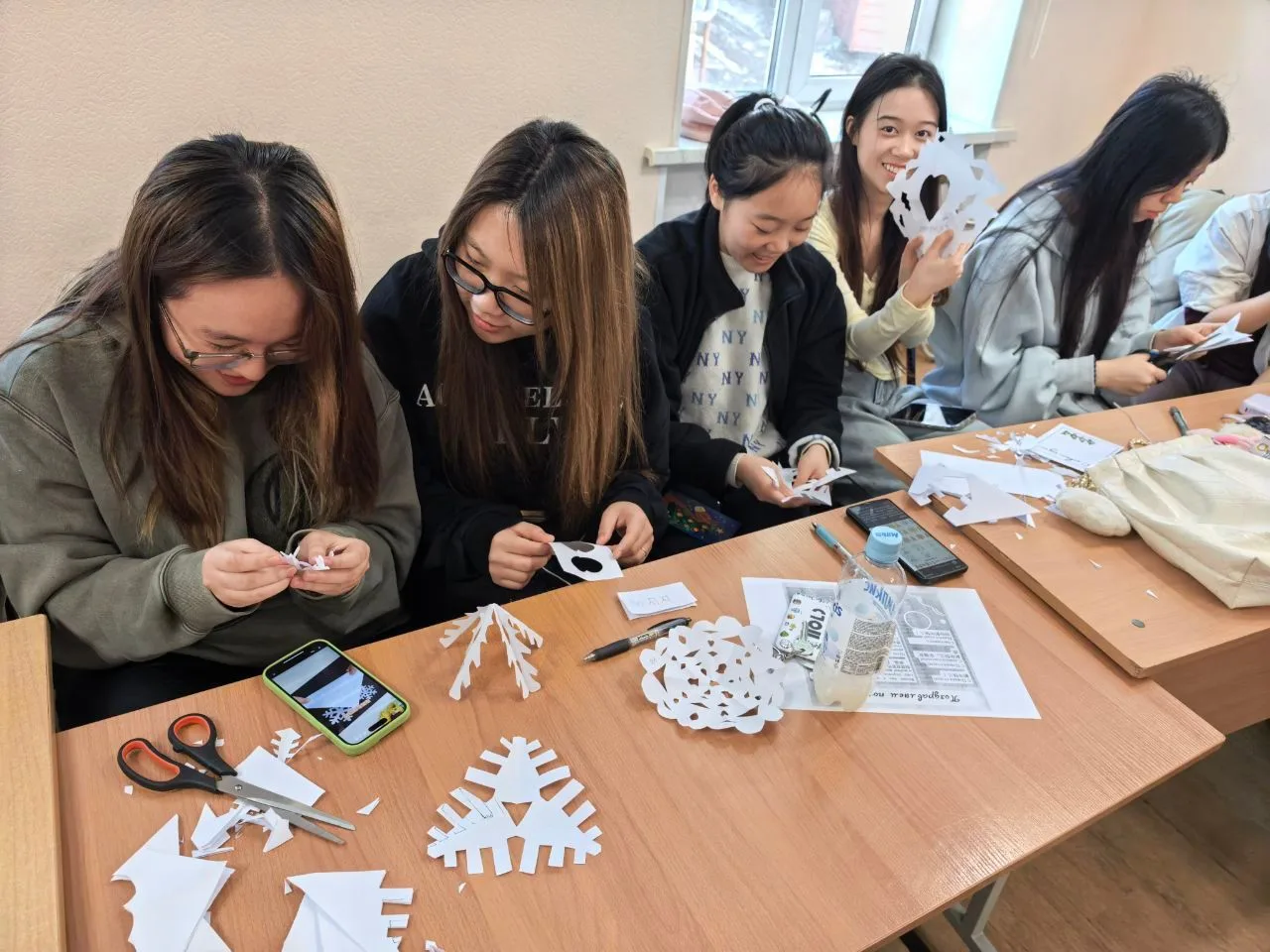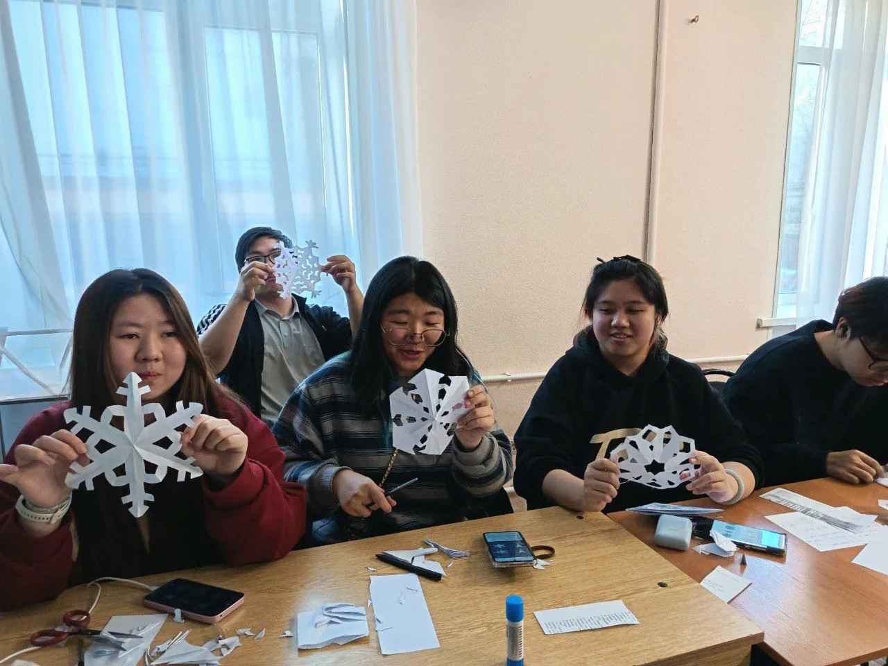 Участникам предлагалось познакомиться с основными новогодними традициями и символами нашей страны, принять участие в тематическом квизе и мастер-классе по изготовлению снежинок. Самые решительные из китайских студентов разыграли перед своими друзьями новогоднюю сказку, выступив в роли Деда Мороза, Снегурочки и лесных зверей.