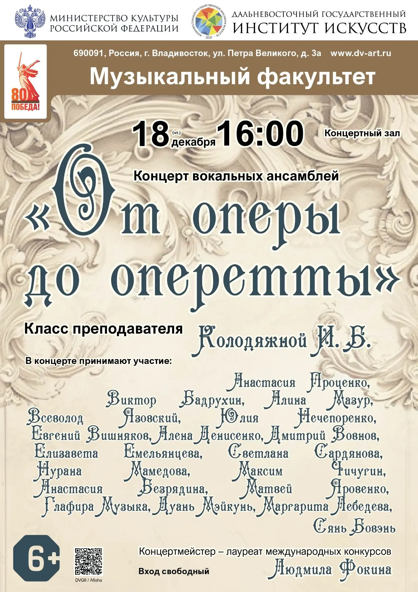 18 декабря в Концертном зале Дальневосточного Государственного института искусств состоится концерт вокальных ансамблей. В концерте принимают участие студенты класса преподавателя И.Б. Колодяжной.