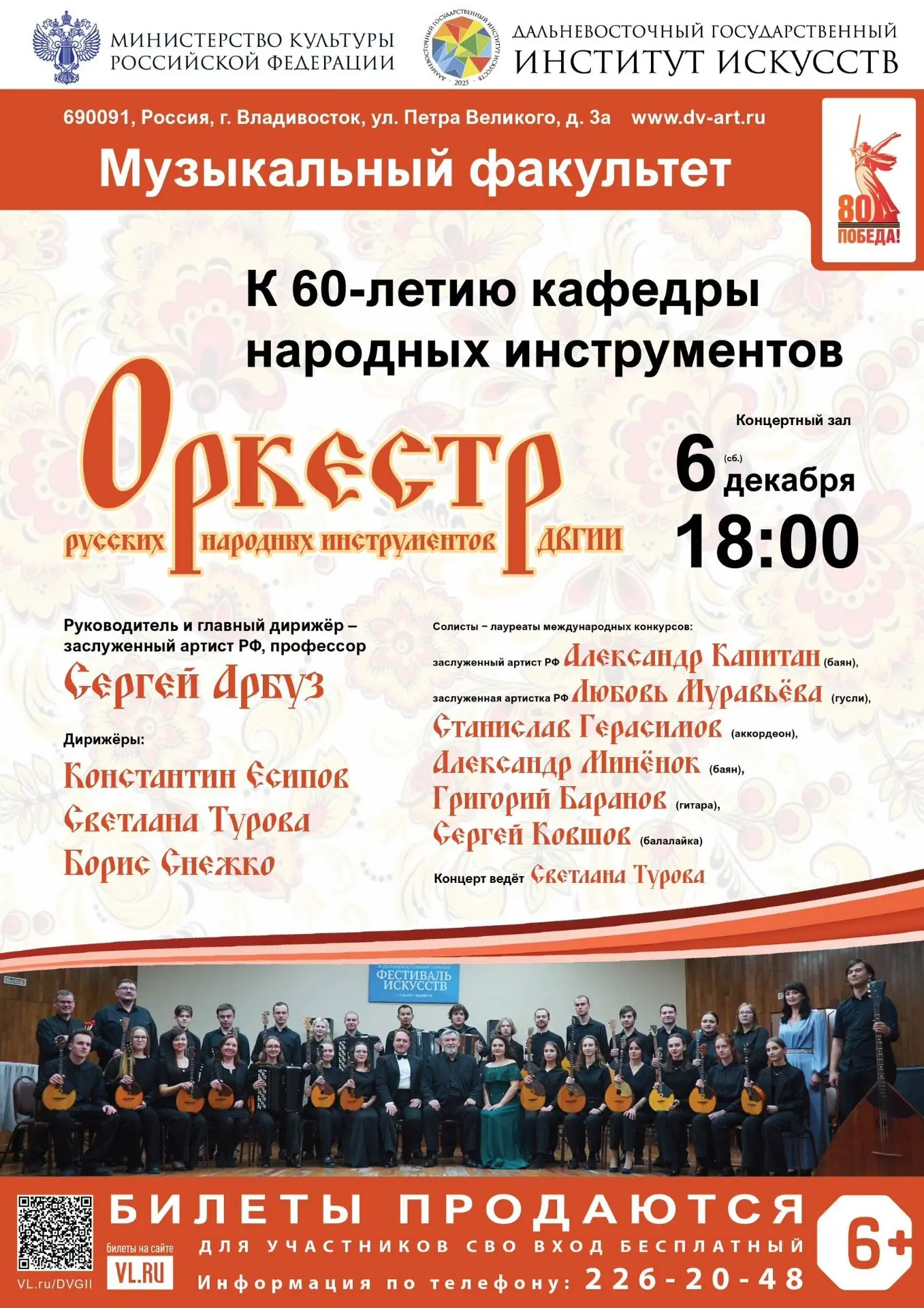 6 декабря Дальневосточный государственный институт искусств приглашает на концерт Оркестра русских народных инструментов ДВГИИ, посвященный 60-летию кафедры народных инструментов.
