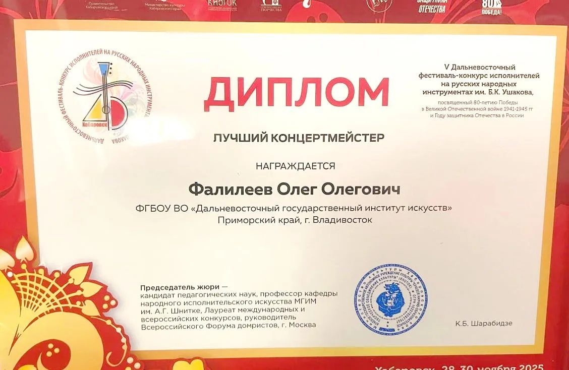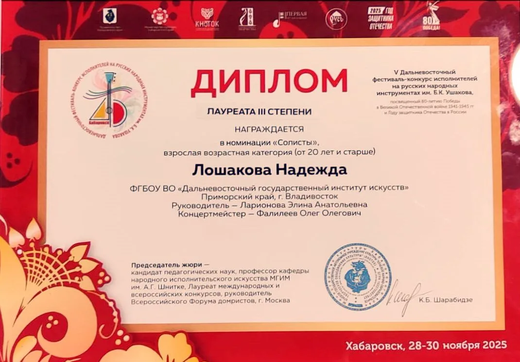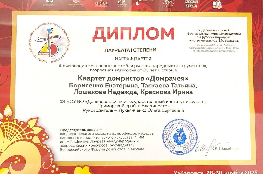 С 28 по 30 ноября 2025 года в г. Хабаровске состоялся V Дальневосточный фестиваль-конкурс исполнителей на русских народных инструментах им. Б.К. Ушакова, посвященный 80-летию Победы в Великой Отечественной войне и Году защитника Отечества.