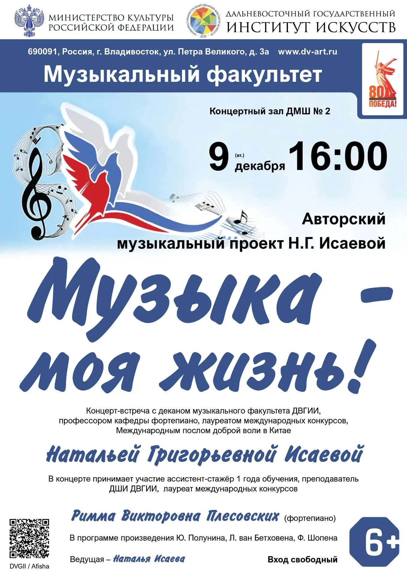 В Концертном зале Детской музыкальной школы №2 состоится концерт-встреча с деканом музыкального факультета Дальневосточного государственного института искусств, профессором кафедры фортепиано, лауреатом международных конкурсов, Международным послом доброй воли в Китае Натальей Григорьевной Исаевой. Наталья Григорьевна представит авторский музыкальный проект "Музыка – моя жизнь!".