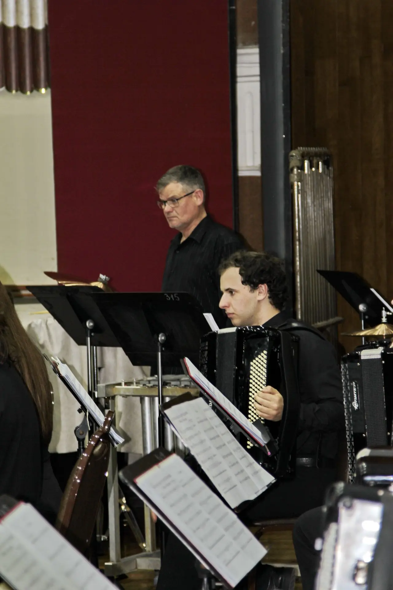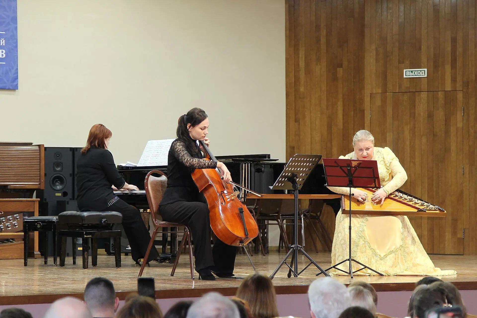 Прозвучали произведения для домры, балалайки, баяна, аккордеона и ансамблей русских народных инструментов. И вновь в исполнении гостьи Любови Муравьевой прозвучала еще одна дальневосточная премьера – сюита «История любви» в трёх частях В. Беляева для гуслей звончатых, виолончели и фортепиано. В состав трио вошли лауреаты всероссийских и международных конкурсов Юлия Колмогорцева (виолончель) и Ирина Лушпа (фортепиано).