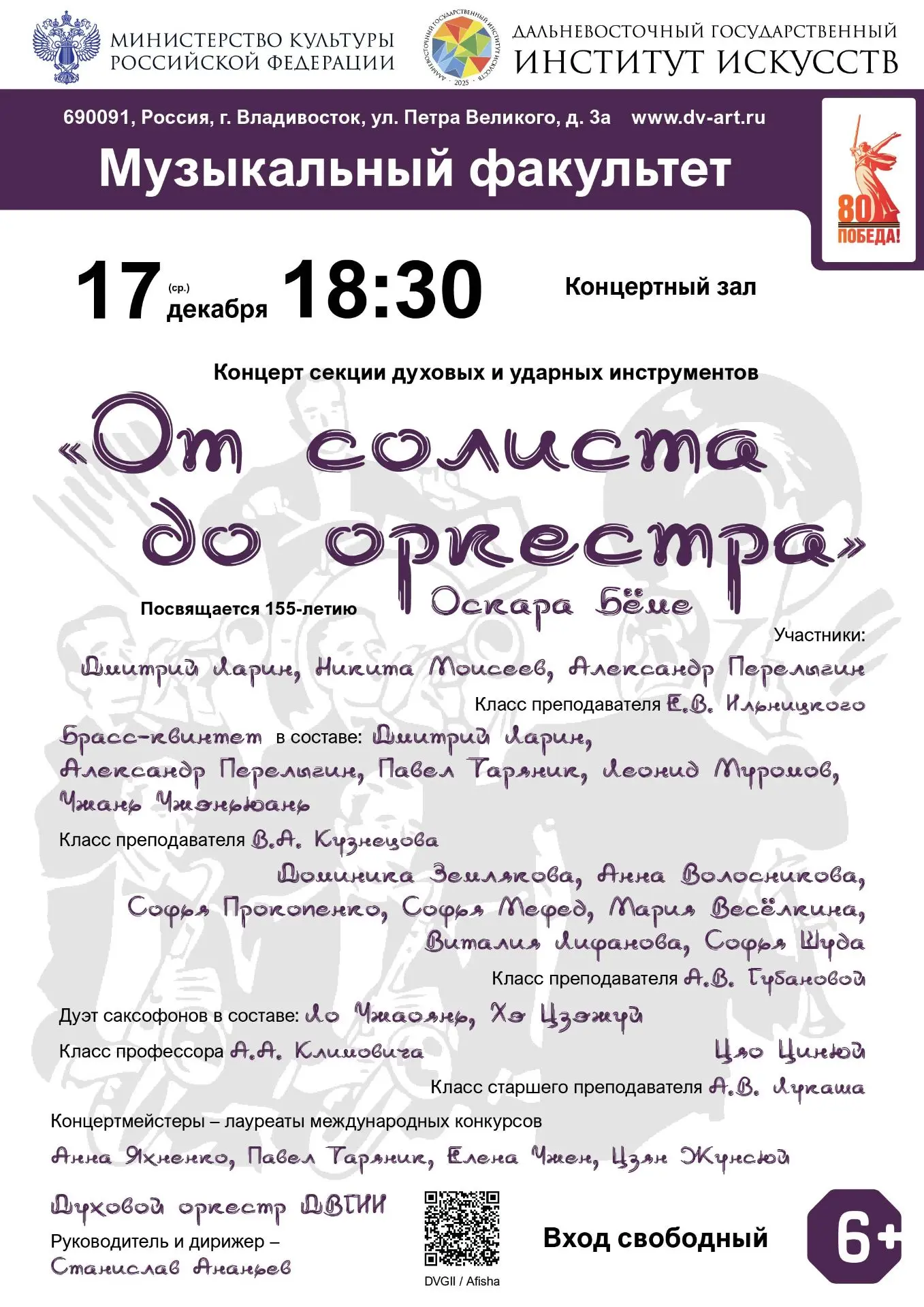 17 декабря в Концертном зале Дальневосточного института искусств прошел концерт секции духовых и ударных инструментов, посвященный 155-летию Оскара Бёме.