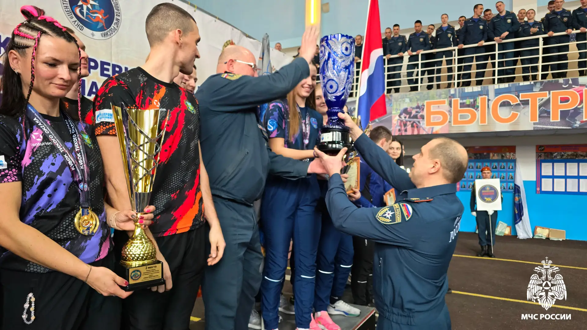 В торжественной обстановке победителям вручили кубки, медали, грамоты и ценные подарки. Главный приз соревнований — Кубок Тихого океана — по праву достался команде Дальневосточной пожарно‑спасательной академии.