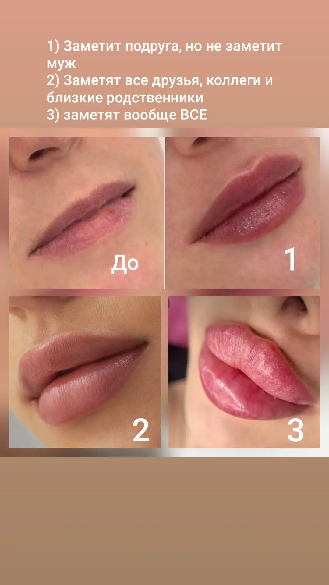 Сразу заметен эффект объема. Для стойкого эффекта курс 3 процедуры (раз в 2-3 месяца).