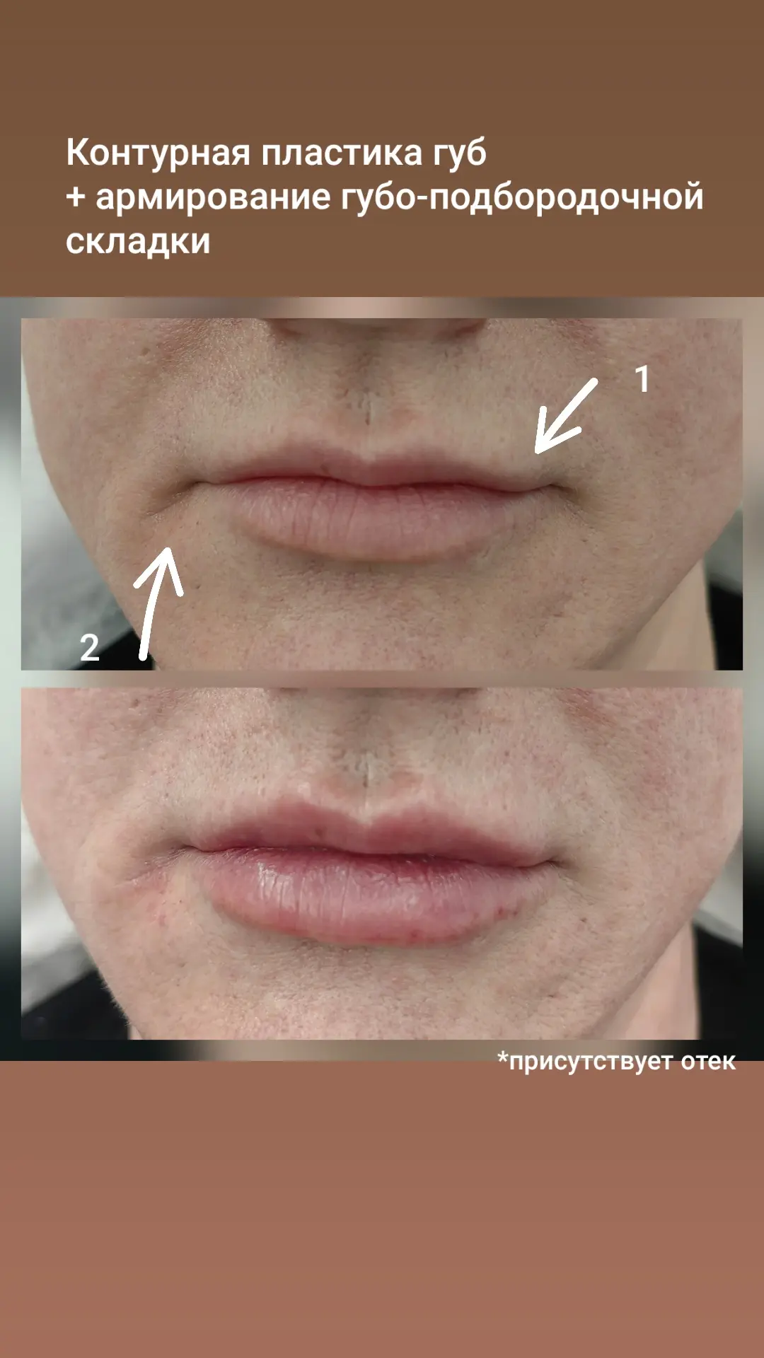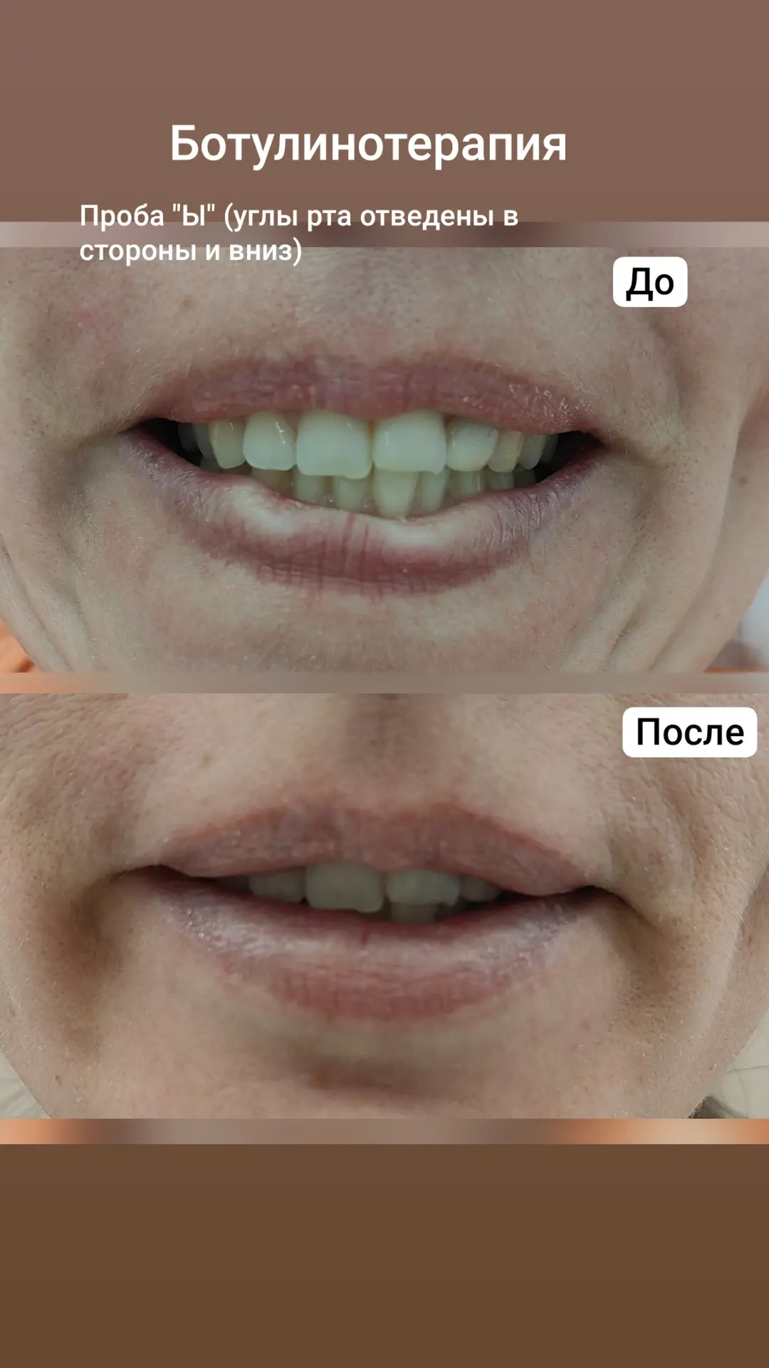 ДО: сочетанный гипертонус круговой мышцы рта, подбородочной мышцы и мышцы опускающей углы рта. ПОСЛЕ: нормотонус м. опускающей углы рта.