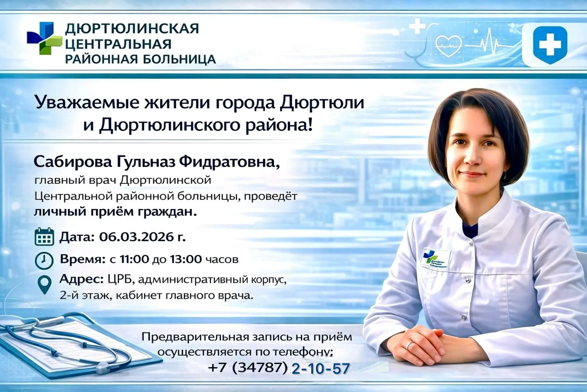 Сабирова Гульназ Фидратовна, главный врач Дюртюлинской Центральной районной больницы, проведёт личный приём граждан.