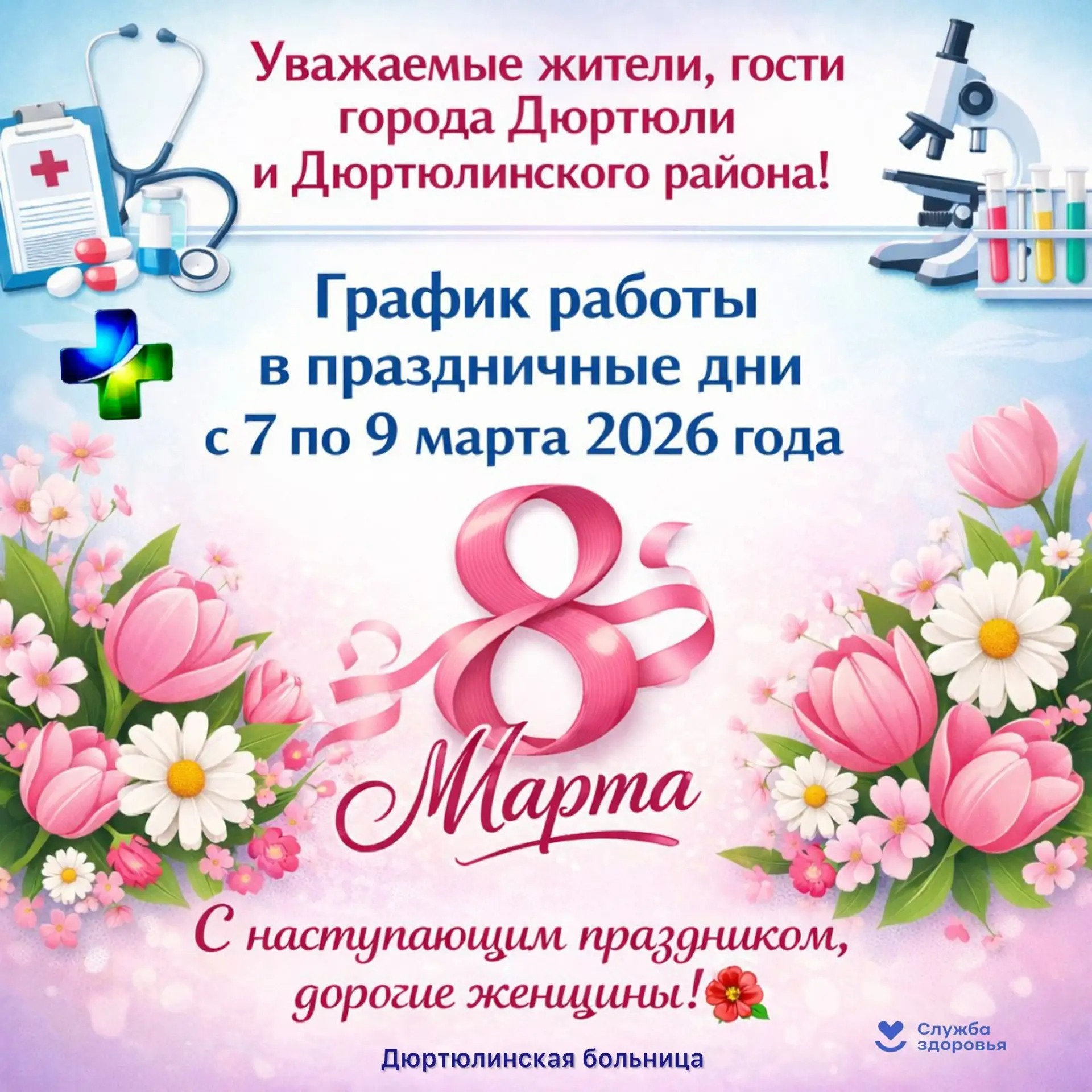Знакомим вас с графиком работы в праздничные дни с с 07 по 9 марта 2026 года.