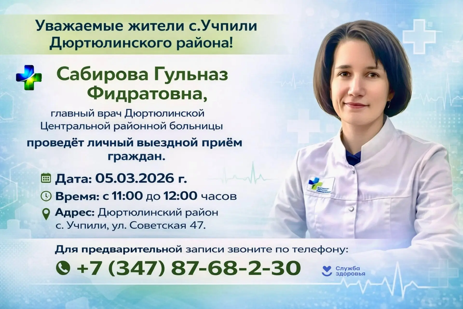 Сабирова Гульназ Фидратовна, главный врач Дюртюлинской Центральной районной больницы, проведёт личный выездной приём граждан.