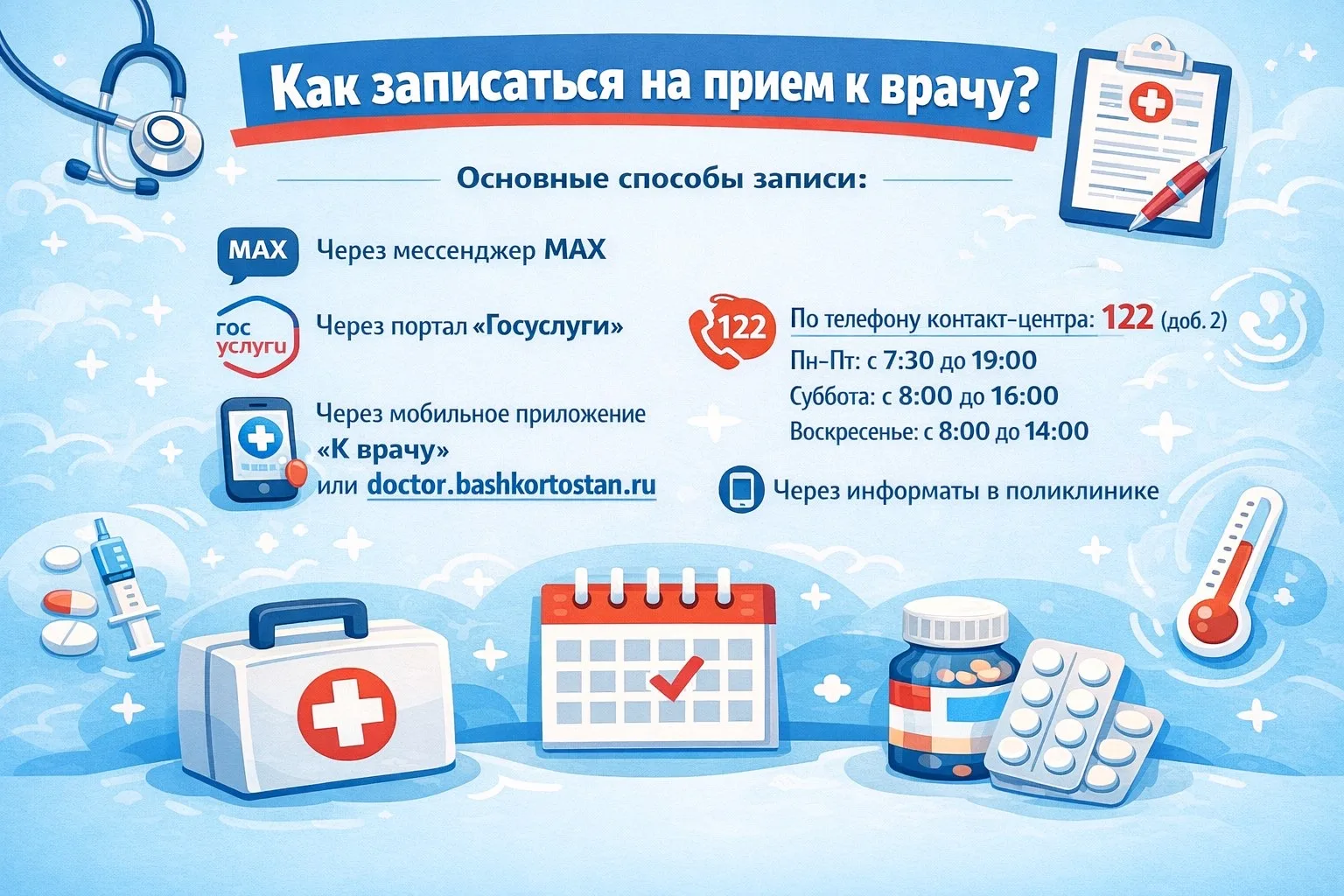 ▪️через мобильное приложение «К врачу» или единый республиканский медицинский портал: doctor.bashkortostan.ru/