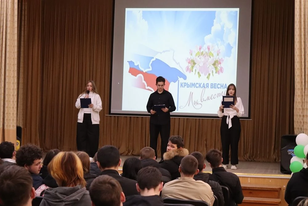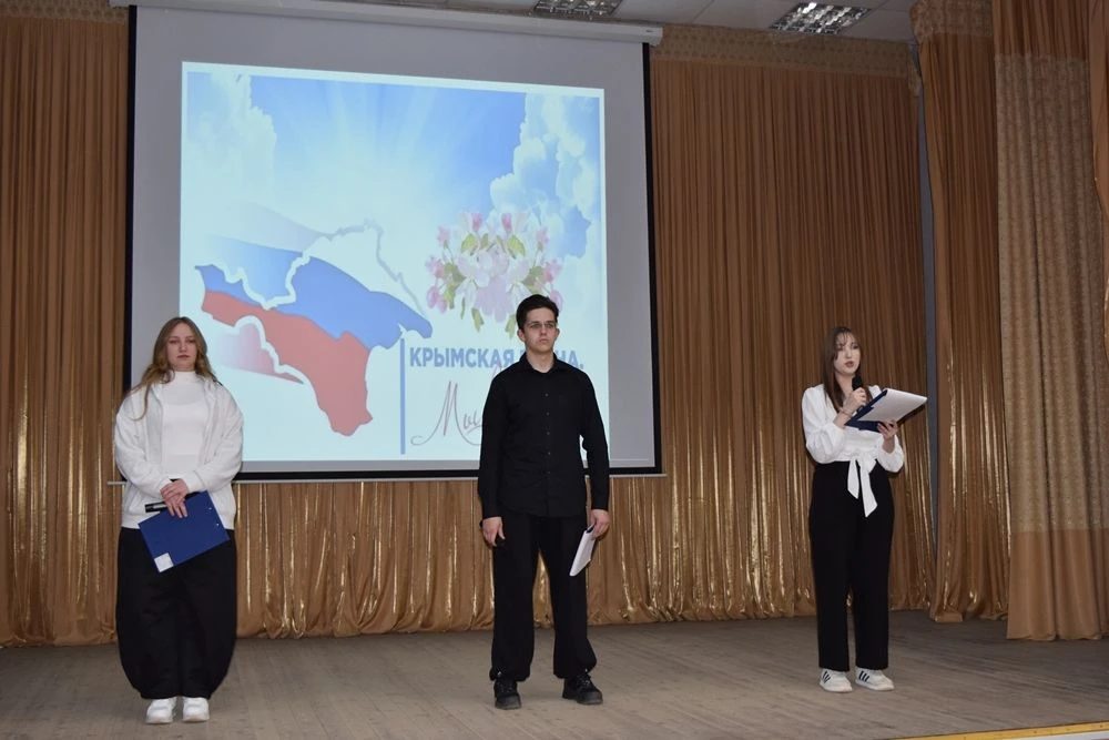 В актовом зале колледжа студенты 31.23 группы под руководством классного руководителя Т.Н. Щегольковой провели открытый классный час на тему «День воссоединения Крыма и России».