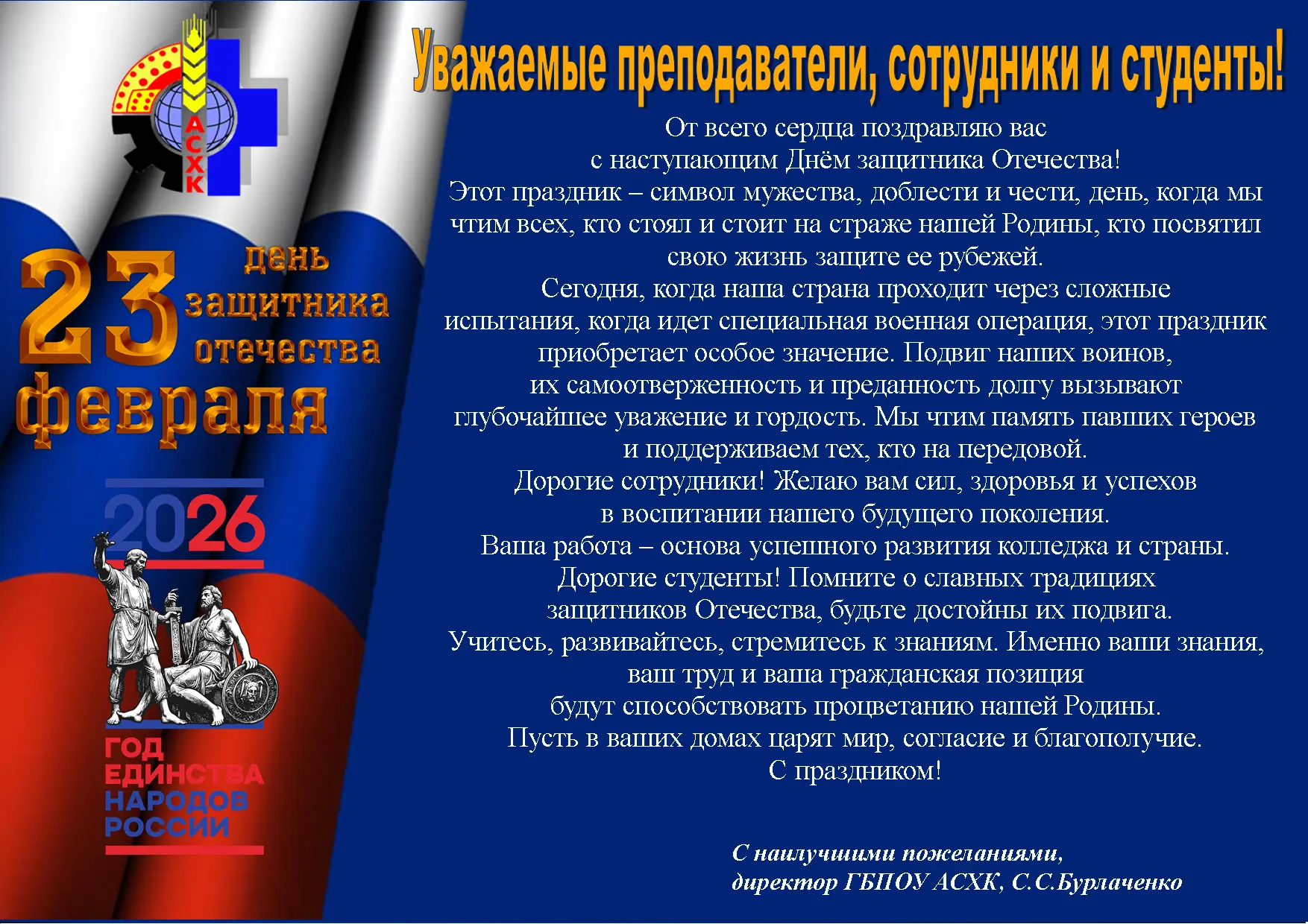В рамках плана воспитательной работы 2 февраля 2026 года в актовом зале колледжа ( ГБПОУ АСХК) было проведено внеурочное мероприятие «Битва за Сталинград!», посвящённое Дню разгрома советскими войсками немецко-фашистских войск в Сталинградской битве