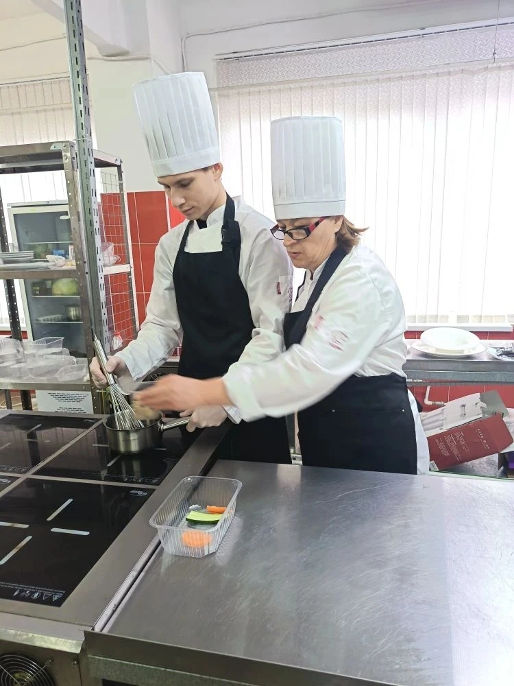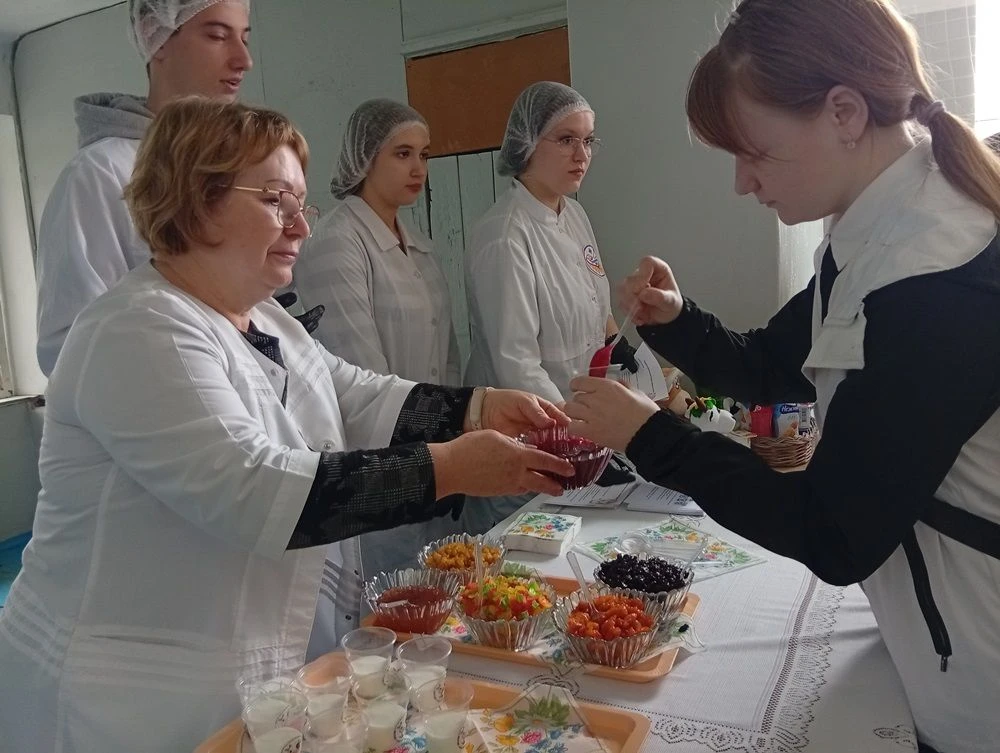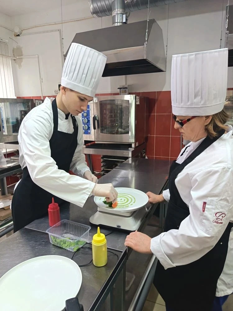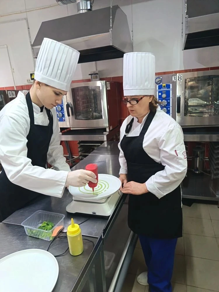 Мастер производственного обучения -Улина М.Ф. готовит студента 3-го курса, Максима Никульникова, к испытаниям, стремясь максимально приблизить тренировки к реальным конкурсным условиям. Максим под чутким руководством мастера совершенствует технику нарезки, доводит до идеала классические рецепты и осваивает авторскую подачу блюд.