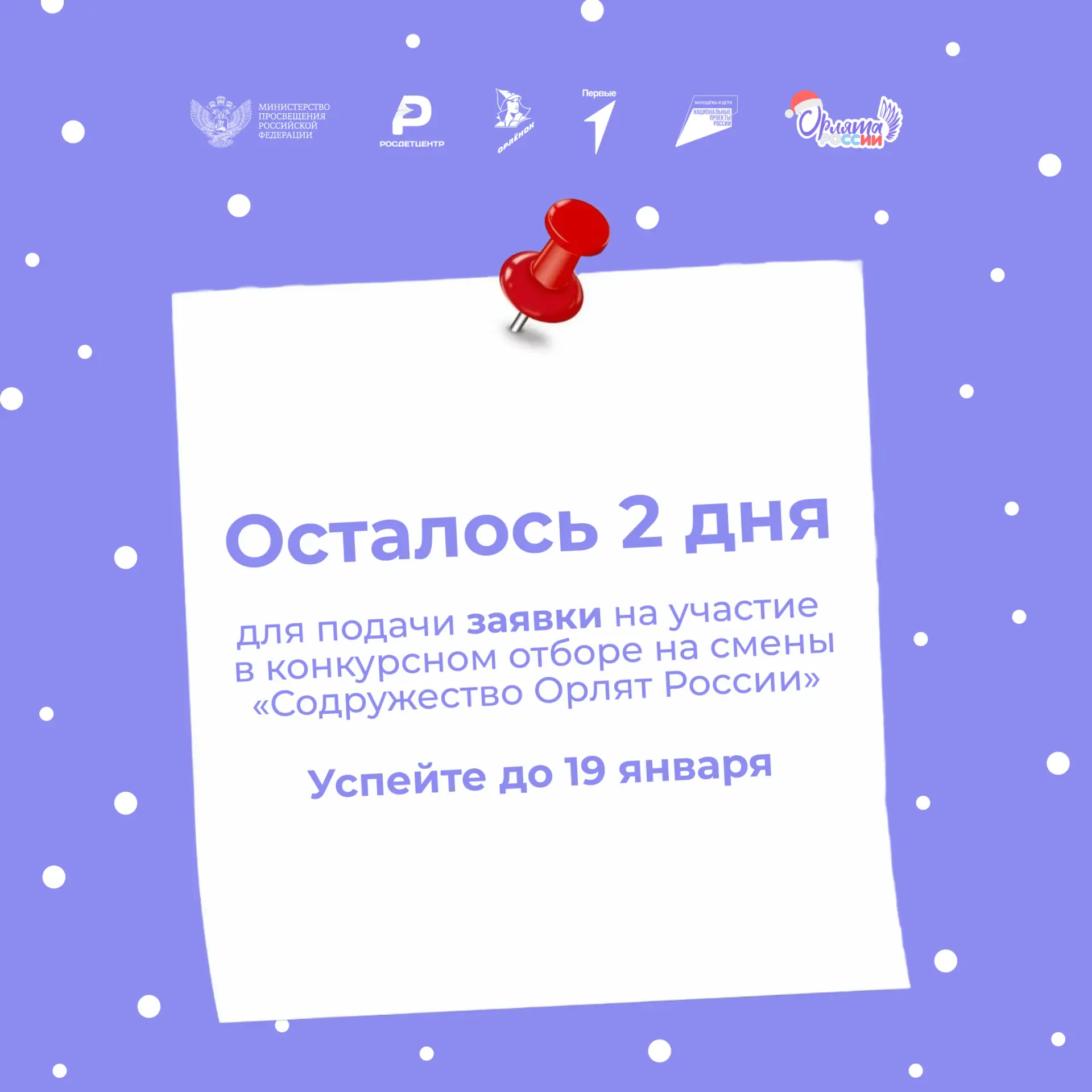 Осталось 2 дня до завершения приёма заявок на участие в конкурсном отборе на Всероссийские смены «Содружество Орлят России».