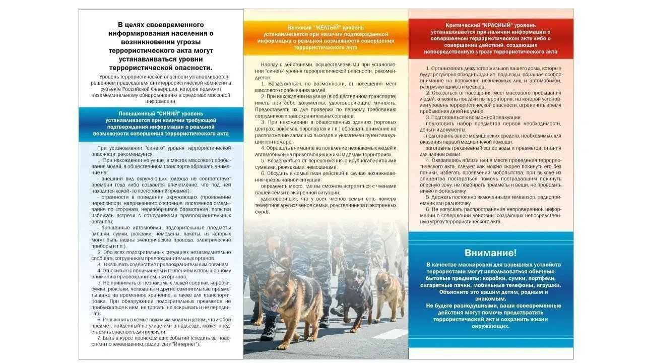 В целях своевременного информирования населения о возникновении угрозы террористического акта могут устанавливаться уровни террористической опасности.