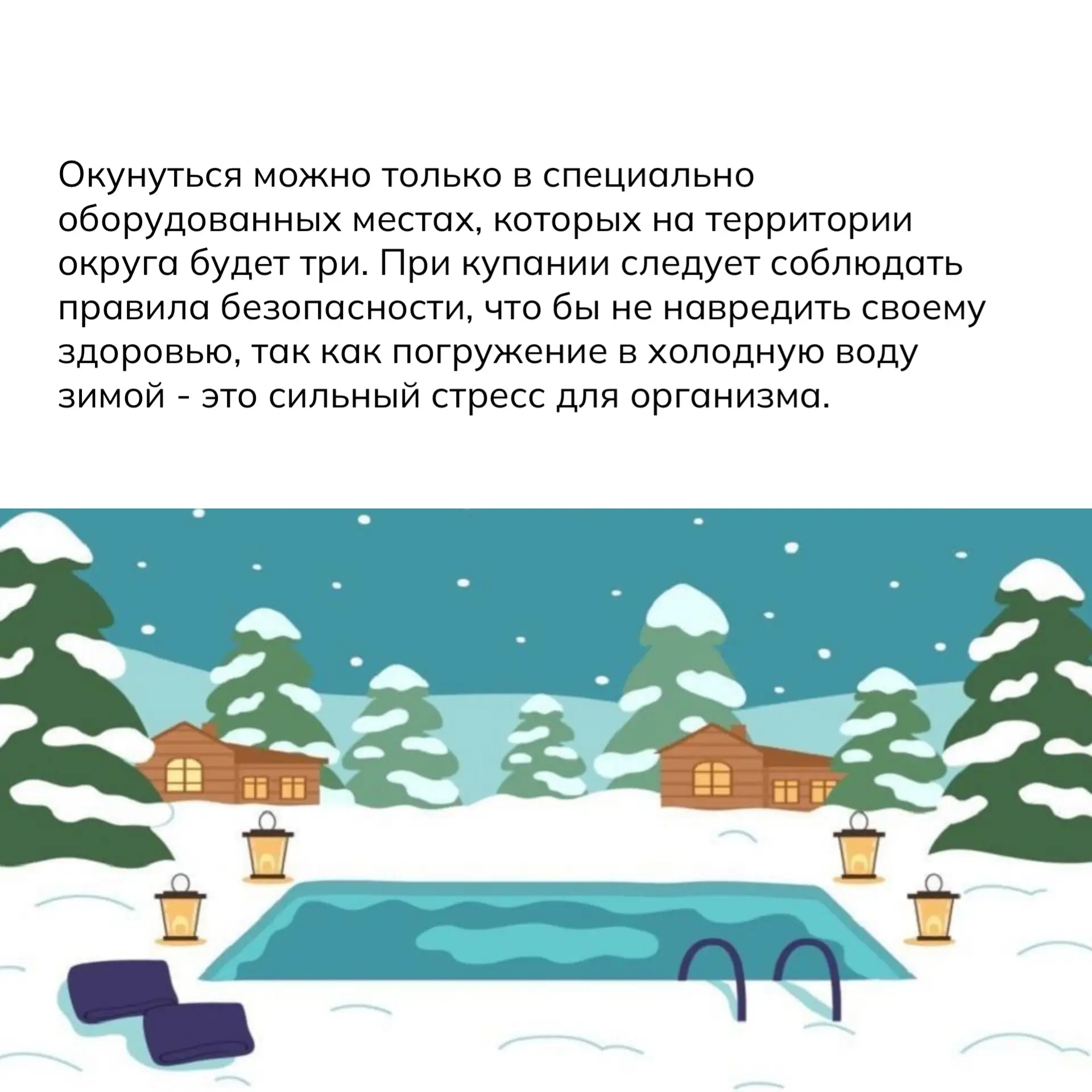 Напоминаем, что специально оборудованных зон на открытых водоемах в округе НЕТ. Для совершения обряда, по благословению настоятелей, будут временно организованы три купели на территориях храмов ⬇️