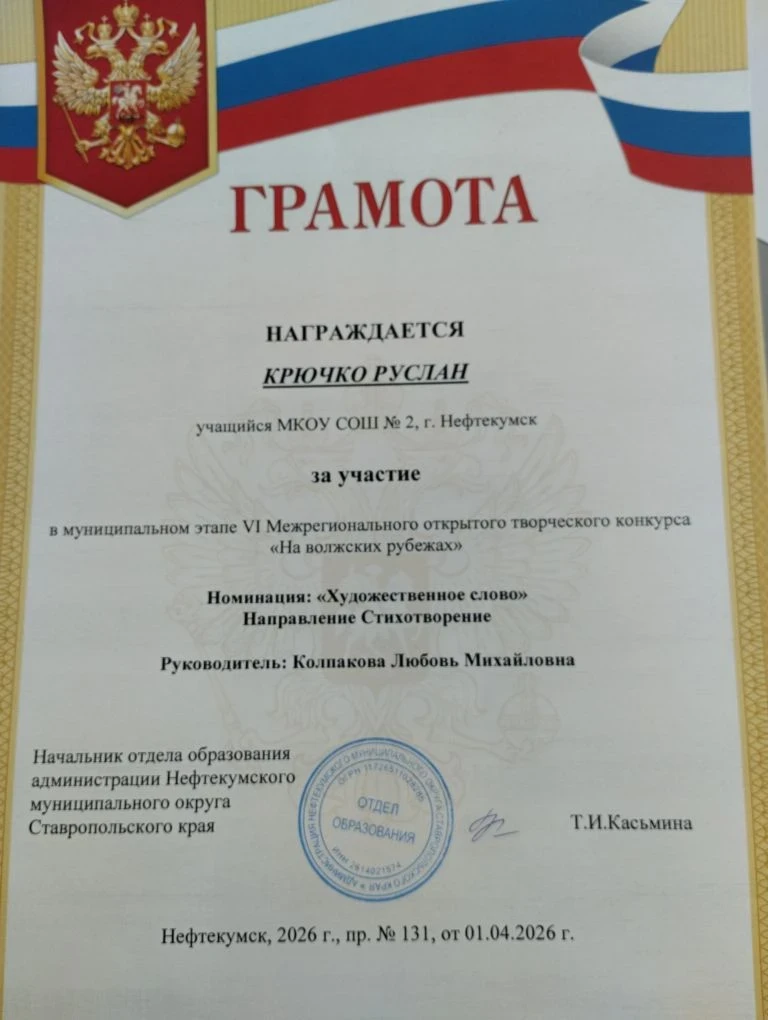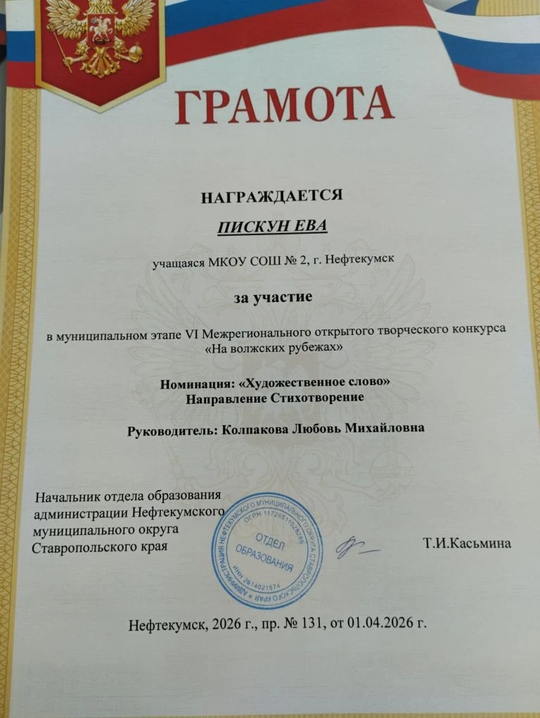 Поздравляем учащихся 5 «А» класса — Крючкова Руслана и Пискун Еву— с активным участием в муниципальном этапе VI Межрегионального открытого творческого конкурса «На Волжских рубежах»!