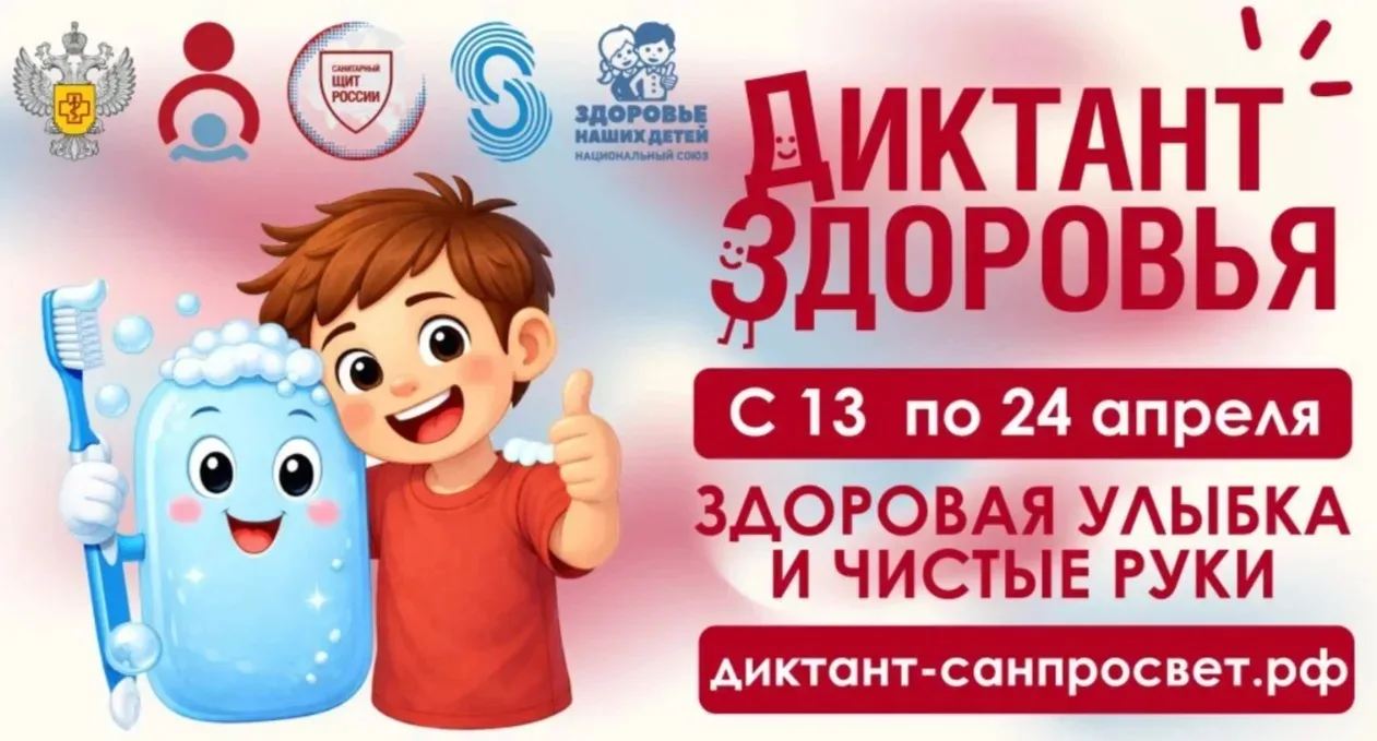 - 13-24 апреля 2026 года: Диктант «Здоровая улыбка и чистые руки», посвящен вопросам соблюдения правил гигиены рук и здоровому питанию;