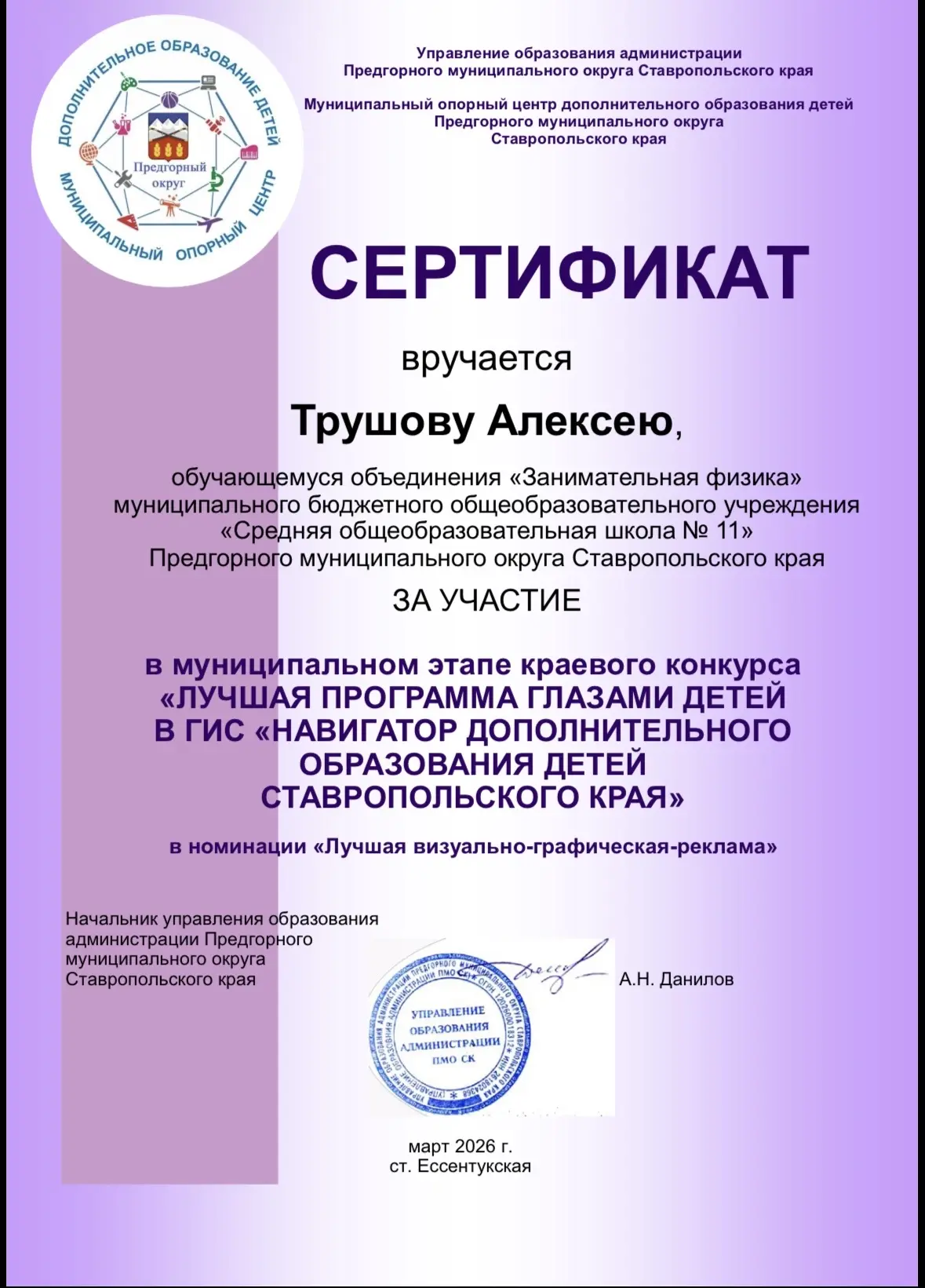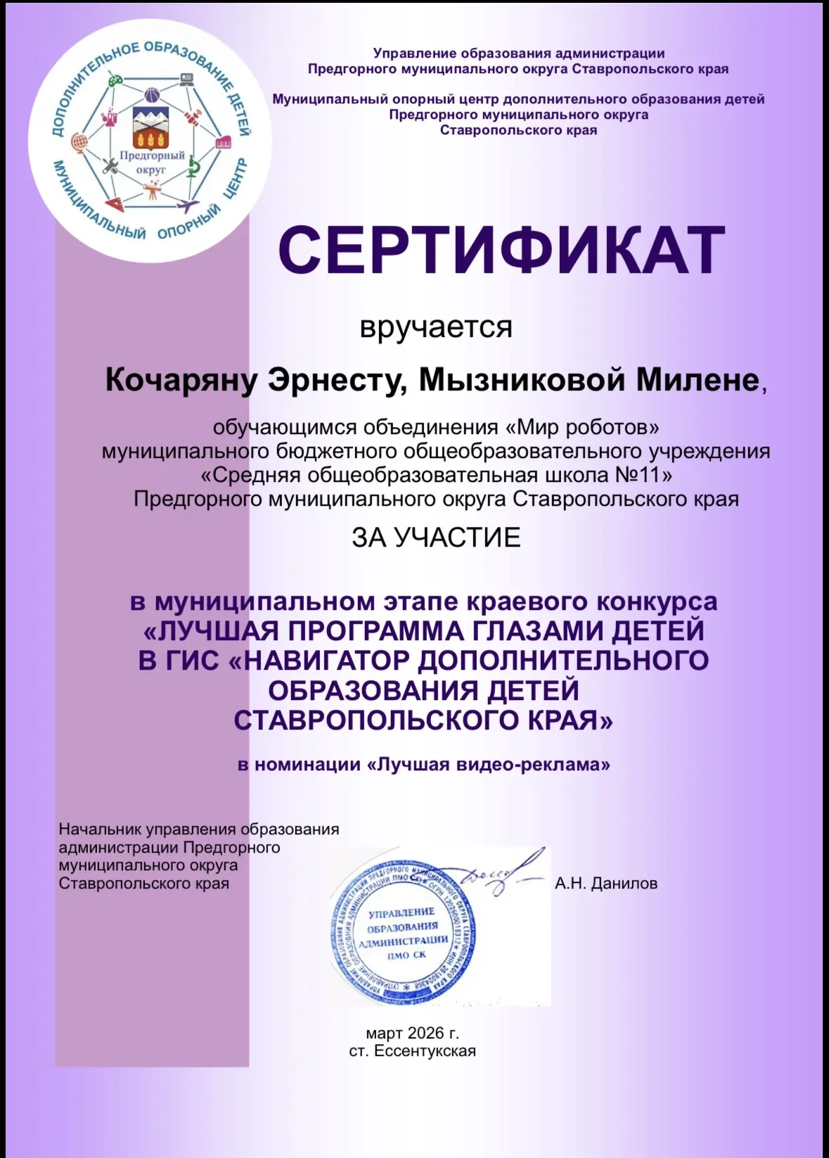 🥰С гордостью сообщаем о прекрасном участии наших талантливых учеников: Трушова Алексея, Кочарян Эрнеста и Мизниковой Милены — на муниципальном этапе краевого конкурса «Лучшая программа глазами детей». Конкурс проходил в ГИС «Навигатор дополнительного образования детей Ставропольского края».