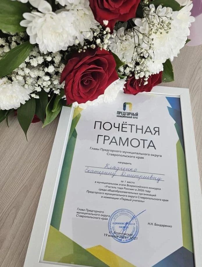 Сердечно поздравляем Кладченко Екатерину Дмитриевну с блестящей победой в муниципальном этапе Всероссийского конкурса «Учитель года России» в 2026 году среди общеобразовательных организаций Предгорного муниципального округа Ставропольского края в номинации «Первый учитель»🎊