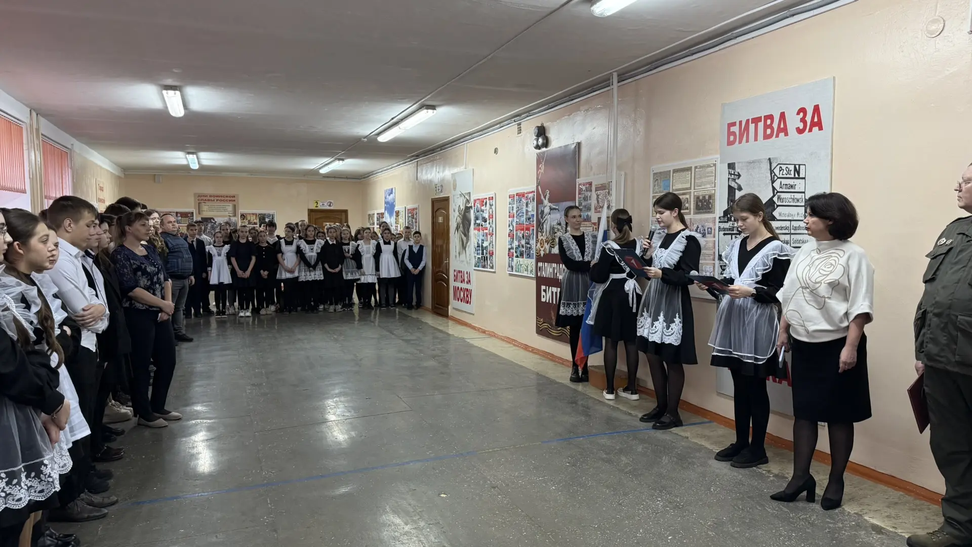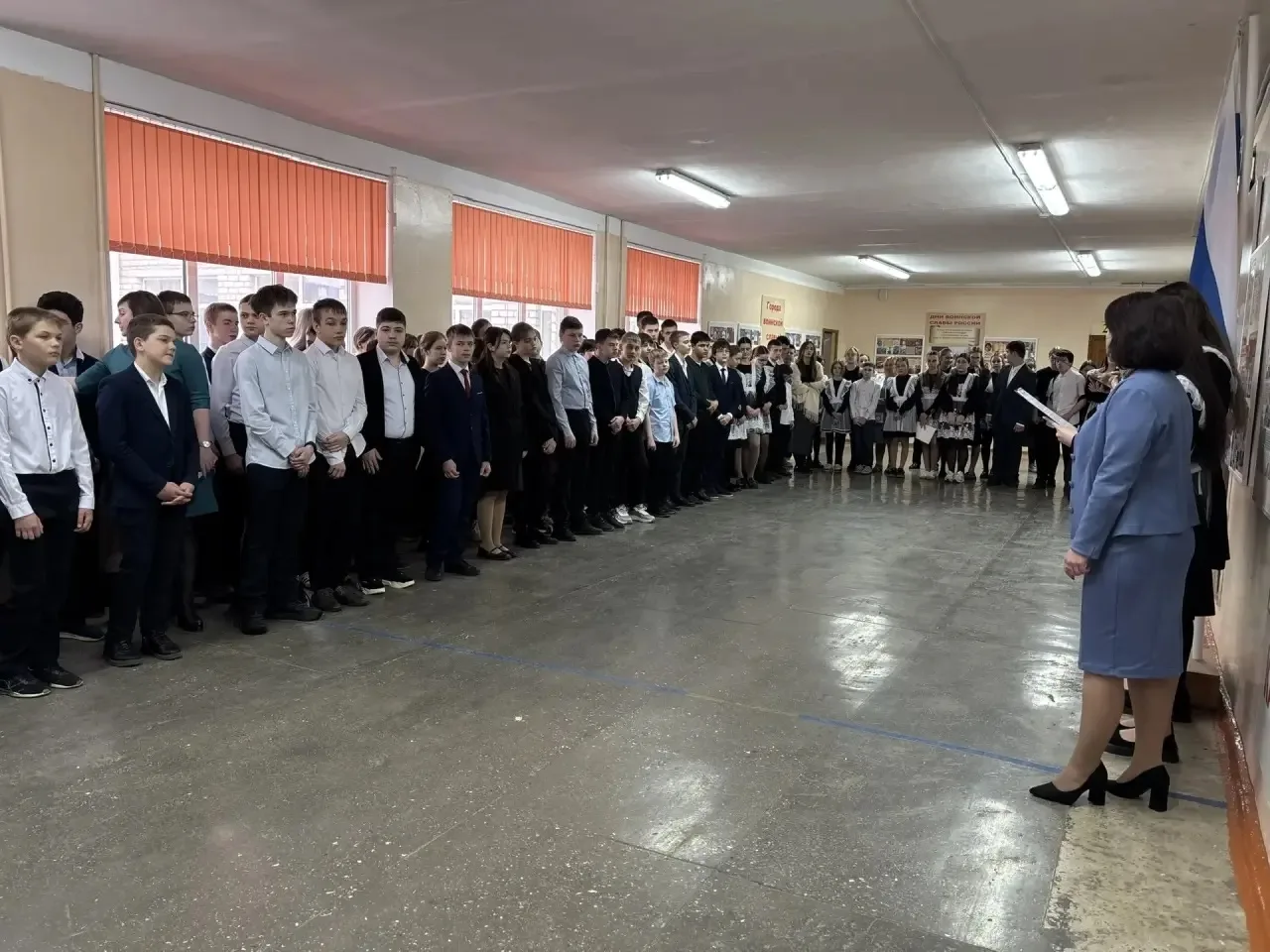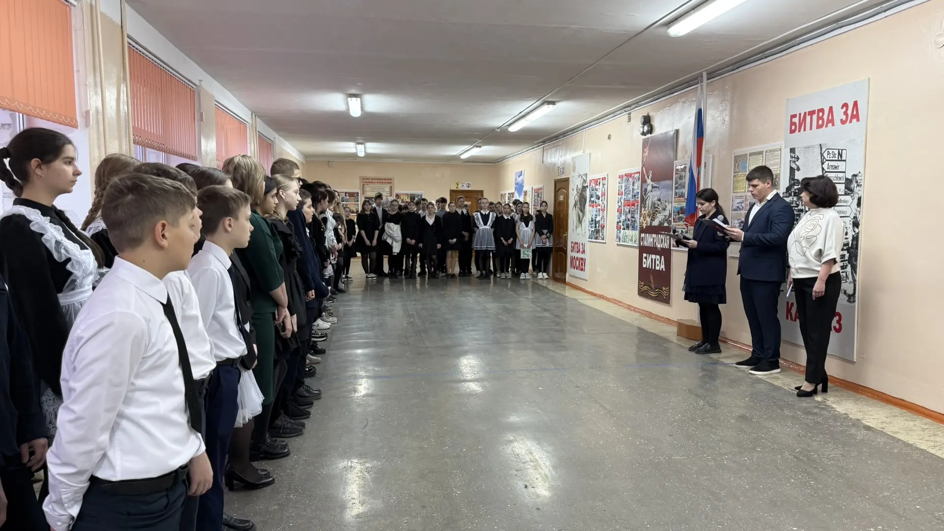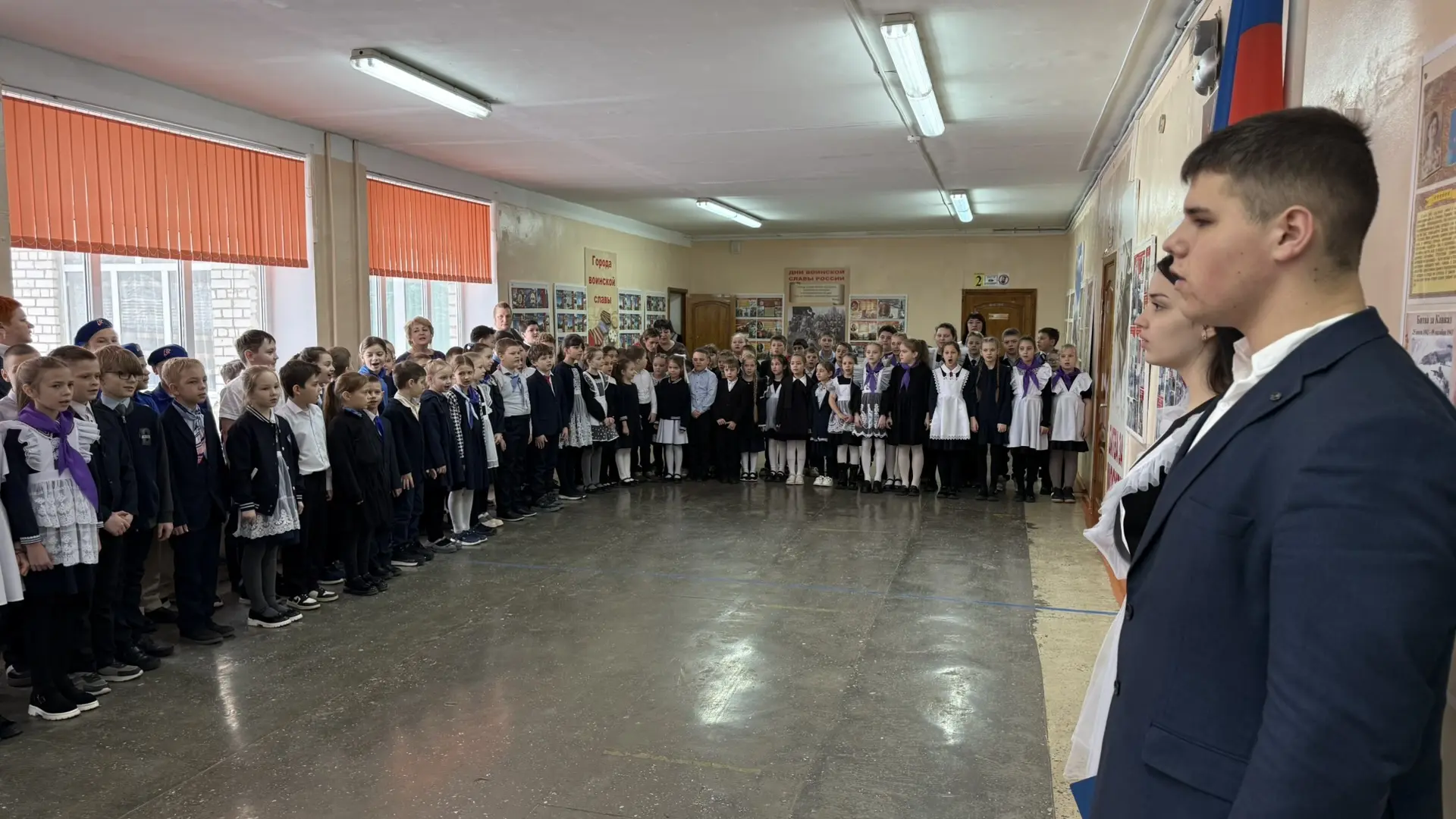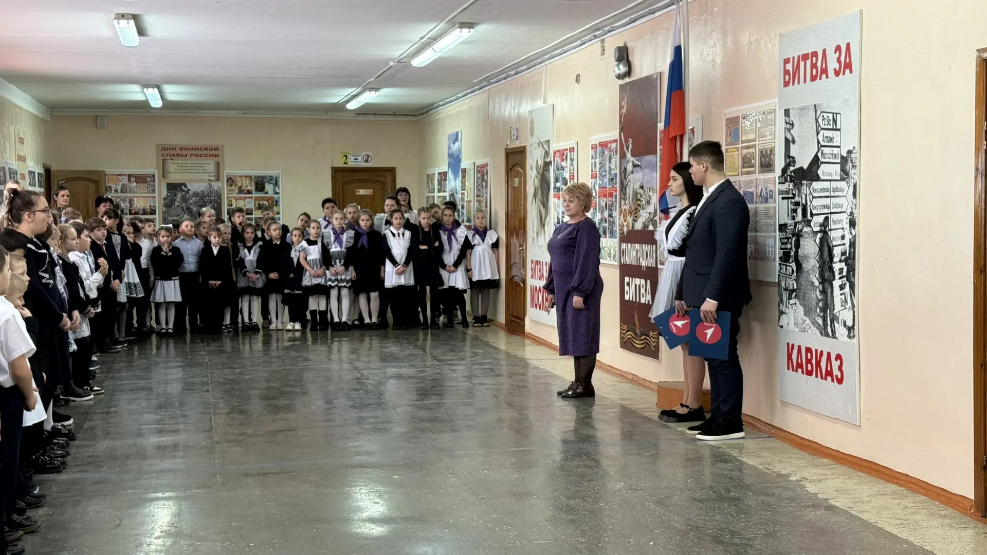 🗣️ На линейке был объявлен месячник оборонно-массовой и военно-патриотической работы, в рамках которого учащихся могут принять участие в «Классных встречах» с участниками СВО, стать организаторами и участниками квестов, посвященных битвам во время Великой Отечественной войны, а также собрать гуманитарную помощь для военнослужащих.