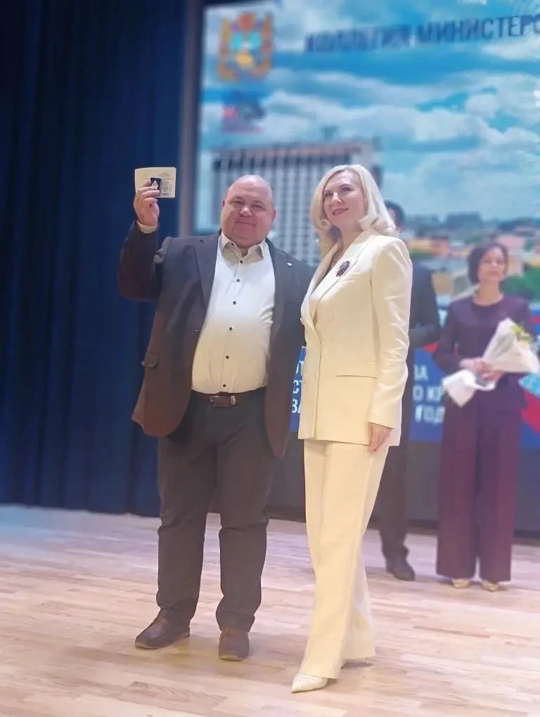 Мария Викторовна Смагина вручила награду Министерства просвещения РФ и министерства образования края, нагрудные знаки «Почетный наставник сферы образования Ставропольского края» Сергею Николаевичу Губанову, учителю технологии школы №2 города Зеленокумска.