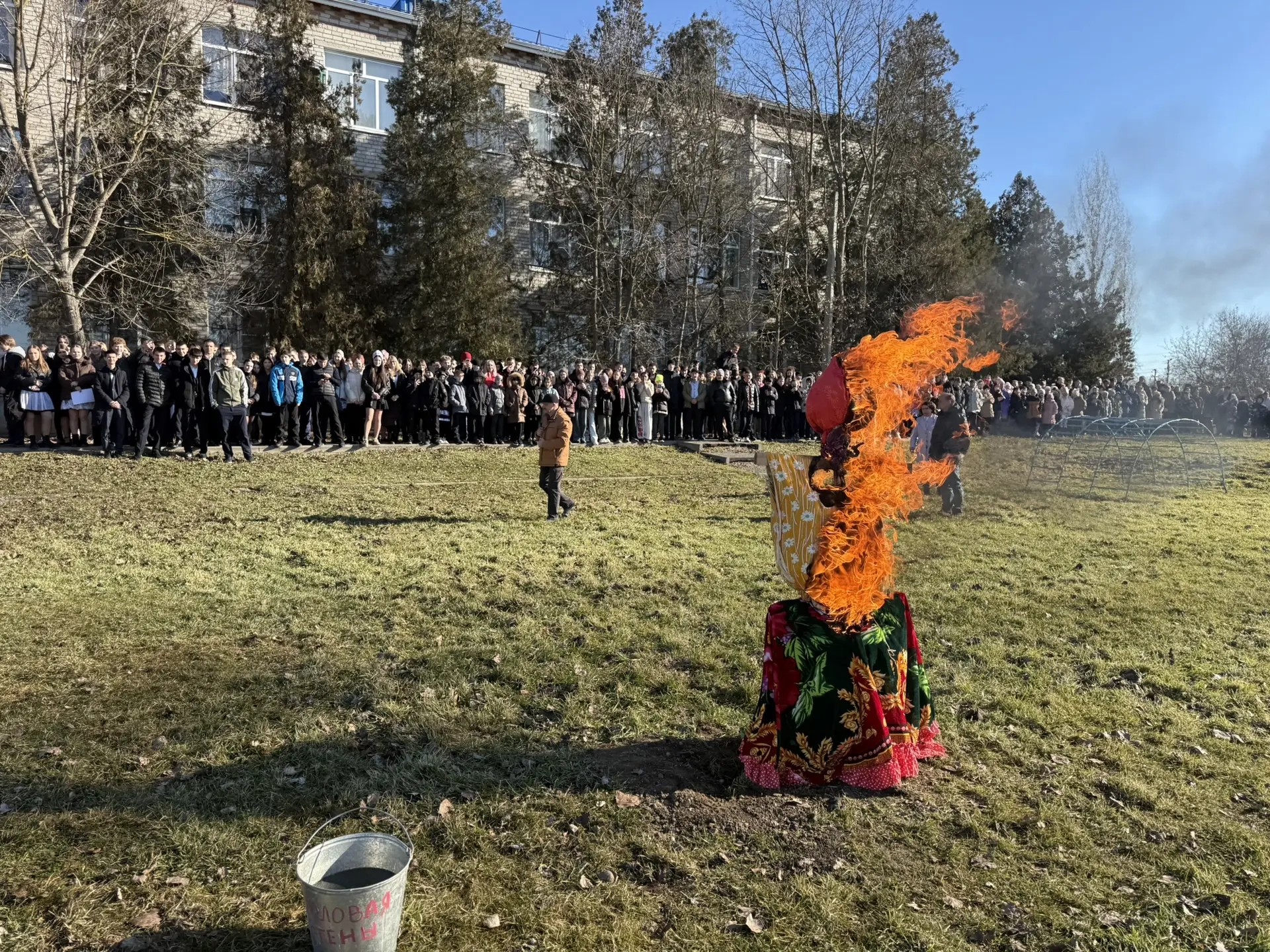 И по традиции в конце празднования на стадионе школы сожгли чучело, провожая зиму и встречая весну.