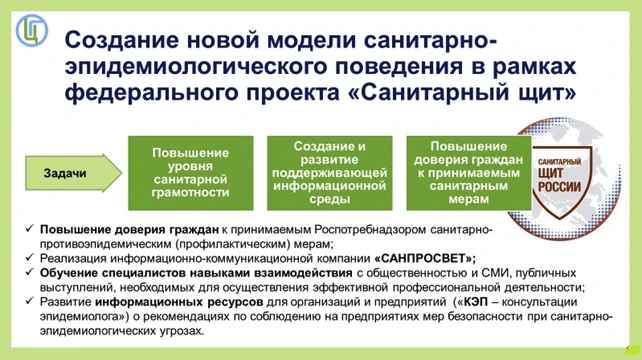 «Санитарный щит» – это федеральный проект, направленный на развитие проактивной и устойчивой системы защиты населения от биологических и санитарно-эпидемиологических угроз.