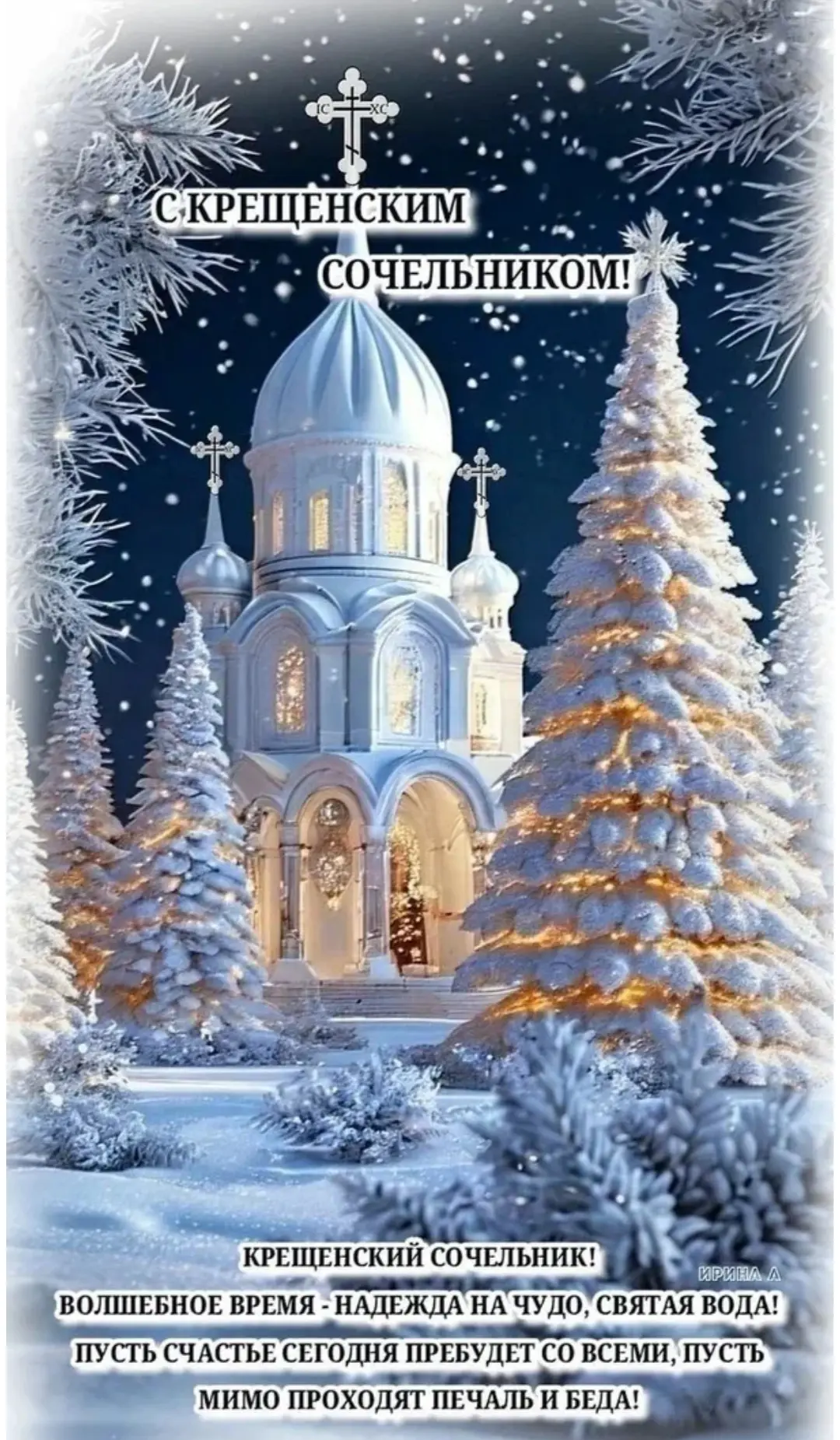 Желаем от всей души в Крещенский сочельник почувствовать и прочувствовать этот светлый праздник, наполнить свои сердца и разум чистыми и светлыми мыслями, укрепить свою веру. Желаем крепкого здоровья и терпимости во всех случаях жизни. Пусть непременно всё задуманное сбудется, все пути будут открыты. В семьях желаем мира и достатка, большого понимания и уважения. Пусть в этот день всё плохое забудется, все обиженные помирятся. Пусть везде непременно будут царить покой и мир.