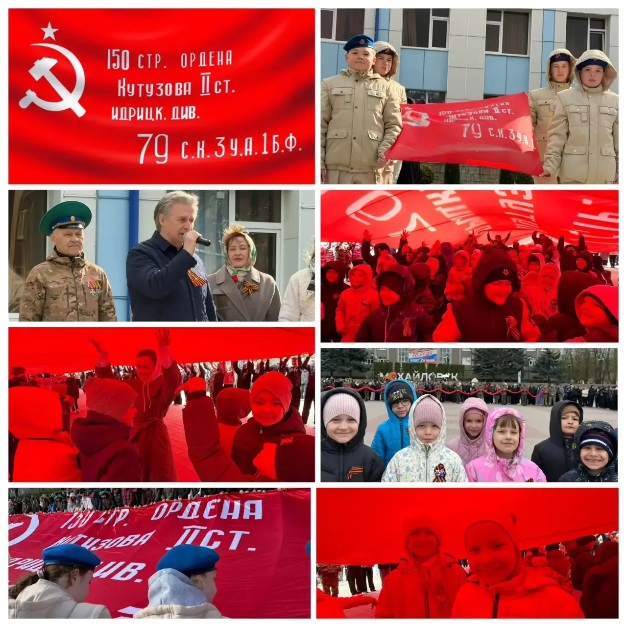 Вместе с учащимися других школ и местными жителями участники акции развернули копию Знамени Победы площадью более 200 квадратных метров. Каждый смог прикоснуться к полотнищу, символизирующему великую реликвию Победы — штурмовой флаг, водружённый 1 мая 1945 года на крыше здания рейхстага в Берлине.