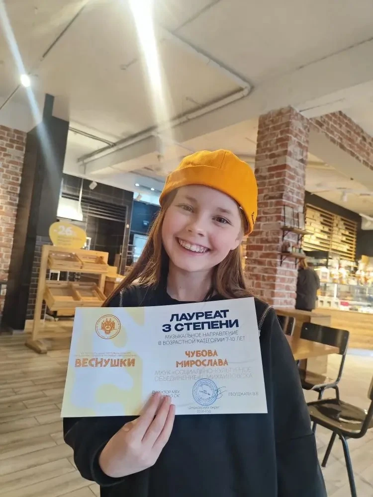 Поздравляем Чубову Мирославу, ученицу 4 в класса МБОУ НОШ № 24, получившую диплом лауреата 3 степени на муниципальном фестивале «Веснушки 2026».