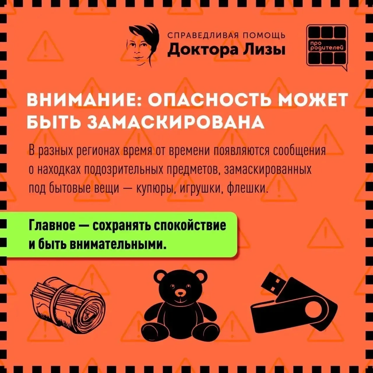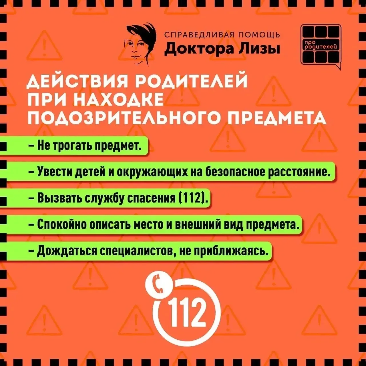 Совместно с МБОО «Справедливая помощь Доктора Лизы» подготовлены краткие рекомендации для родителей и детей — как распознать опасность, не поддаваться любопытству и действовать спокойно и правильно.