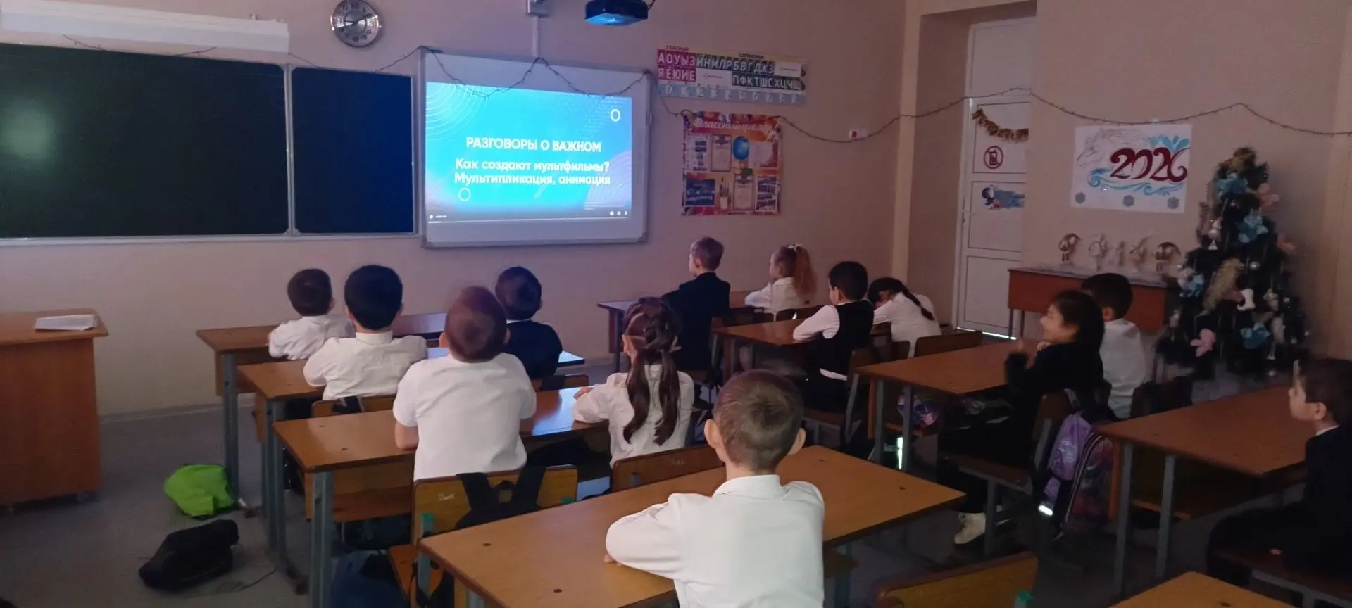 Утро понедельника 12 января 2026 года в школе традиционно началось с торжественной линейки, церемонии поднятия флага и исполнения гимна Российской Федерации и внеурочных занятий «Разговоры о важном» по теме "Как создают мультфильмы?"