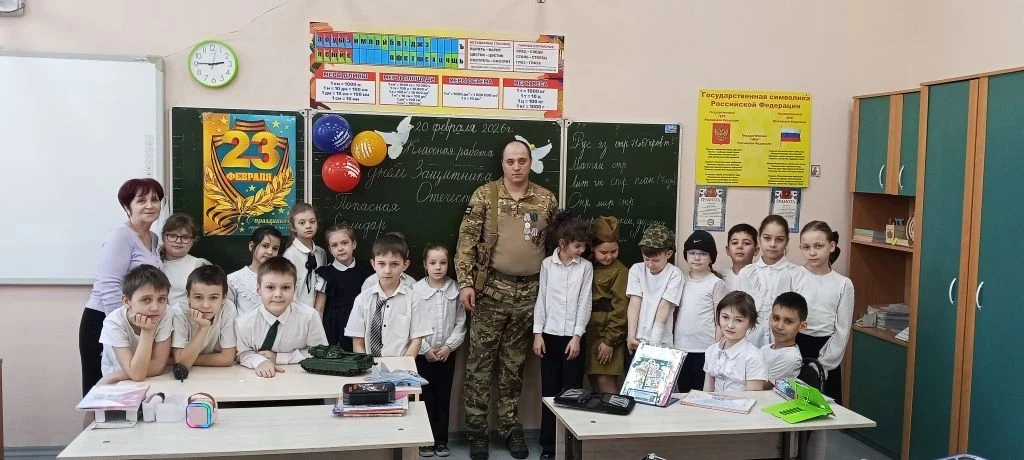Сегодня, 20 февраля 2026 года к учащимся 2 А класса для беседы приходил наш земляк настоящий герой: Антонцев Николай Юрьевич, ветеран боевых действий, младший сержант , участник специальной военной операции. После ампутации обеих ног, пройдя огромный путь реабилитации, встал на протезы и вернулся на передовую . Готов сражаться на протезах и лёжа наступать ! Его девиз - Если идти ! То до конца !