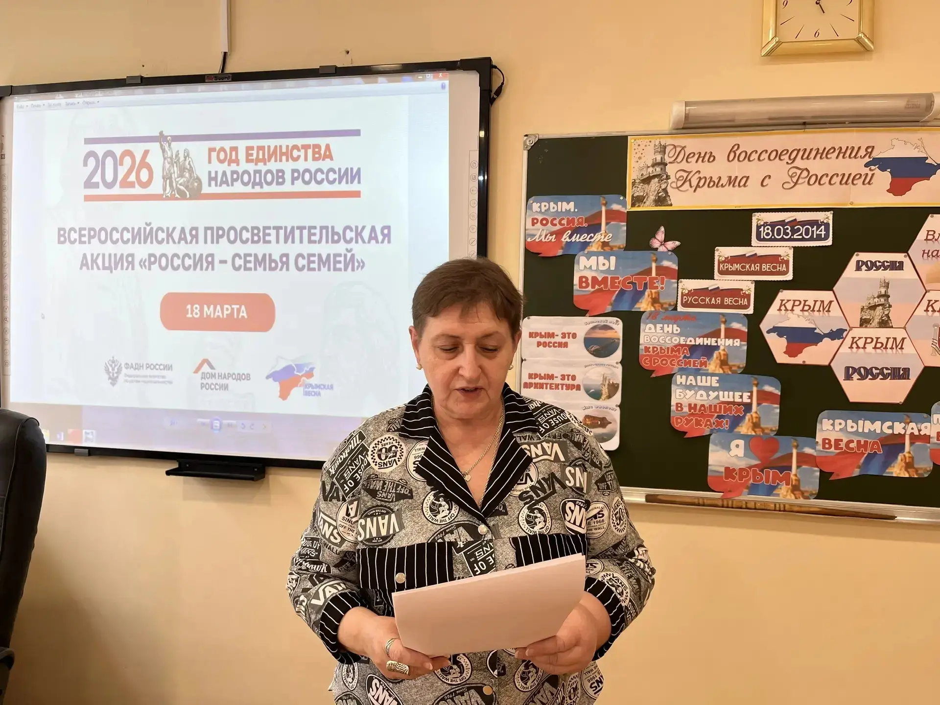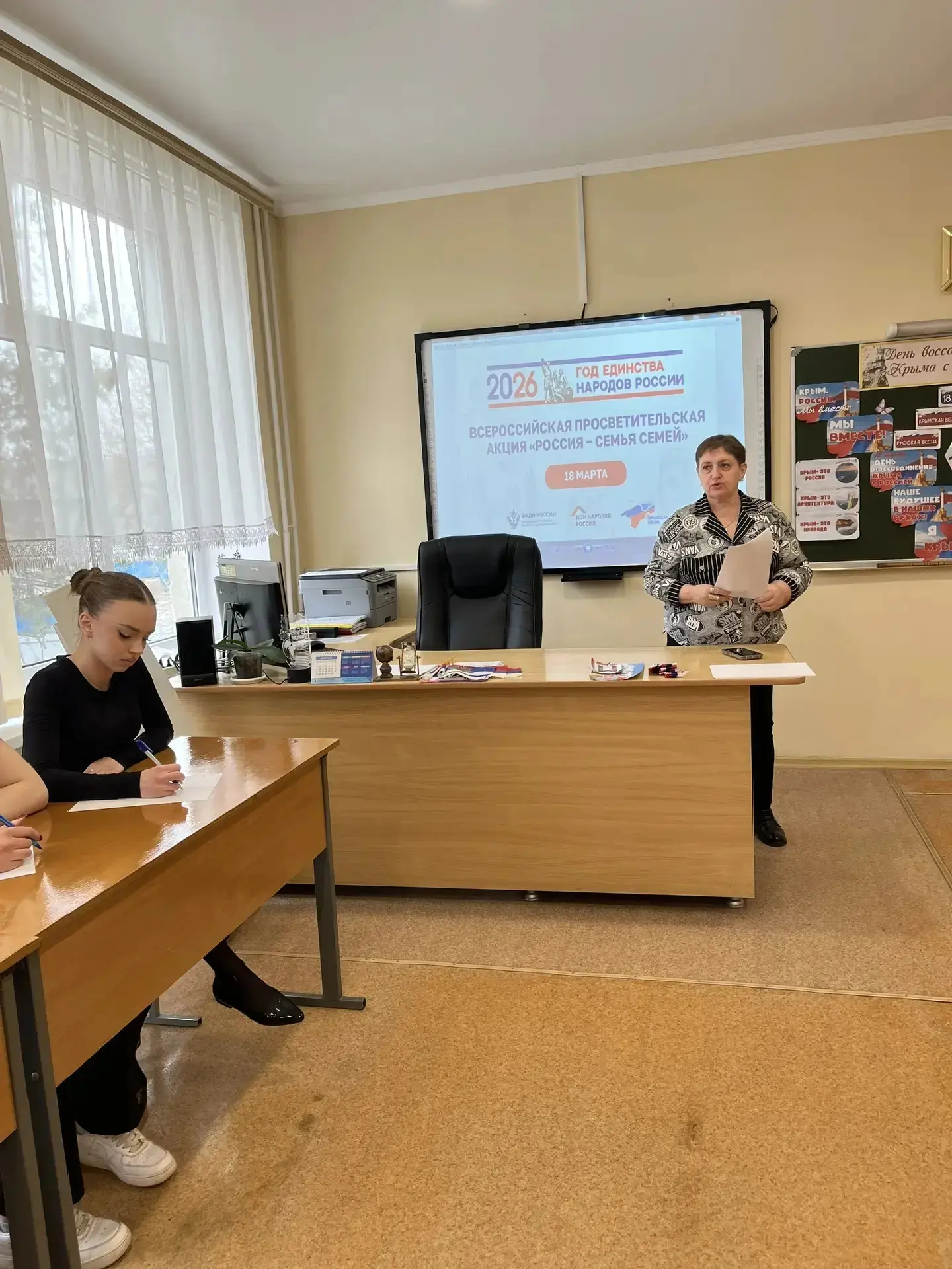 В МБОУ СОШ № 7 18 марта 2026 года, в День воссоединения Крыма с Россией, состоялась Всероссийская просветительская акция, реализованная в формате очного диктанта под названием «Россия — семья семей».