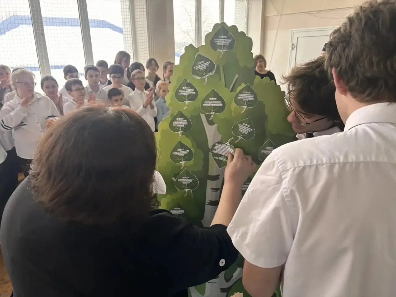 Затем была запущена общешкольная акция «Лист Единства». 🍃 Каждый класс в течение года будет готовить свои проекты, а их символы — листья с названиями дел — будут украшать наше общешкольное Древо, которое подготовлено для реализации проекта и установлено в холле школы, делая его пышным и красивым. 🌳✨