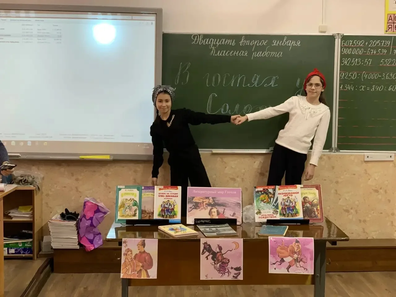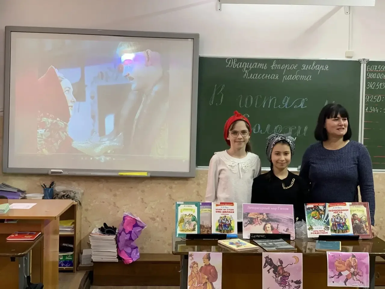 🎓 Ребята с помощью презентации познакомились с биографией и интересными фактами из жизни писателя Н. В. Гоголя, с помощью выставки «Литературный мир Гоголя» познакомились с его произведениями. Юные читатели узнали, что в сборник «Вечеров…» входит повесть «Ночь перед рождеством», которой в этом году исполняется 195 лет. Учащимся напомнили содержание повести «Ночь перед рождеством», ребята вспомнили главных героев, во время мероприятия посмотрели фрагменты из фильма «Ночь перед Рождеством», научились завязывать платок как у Солохи.