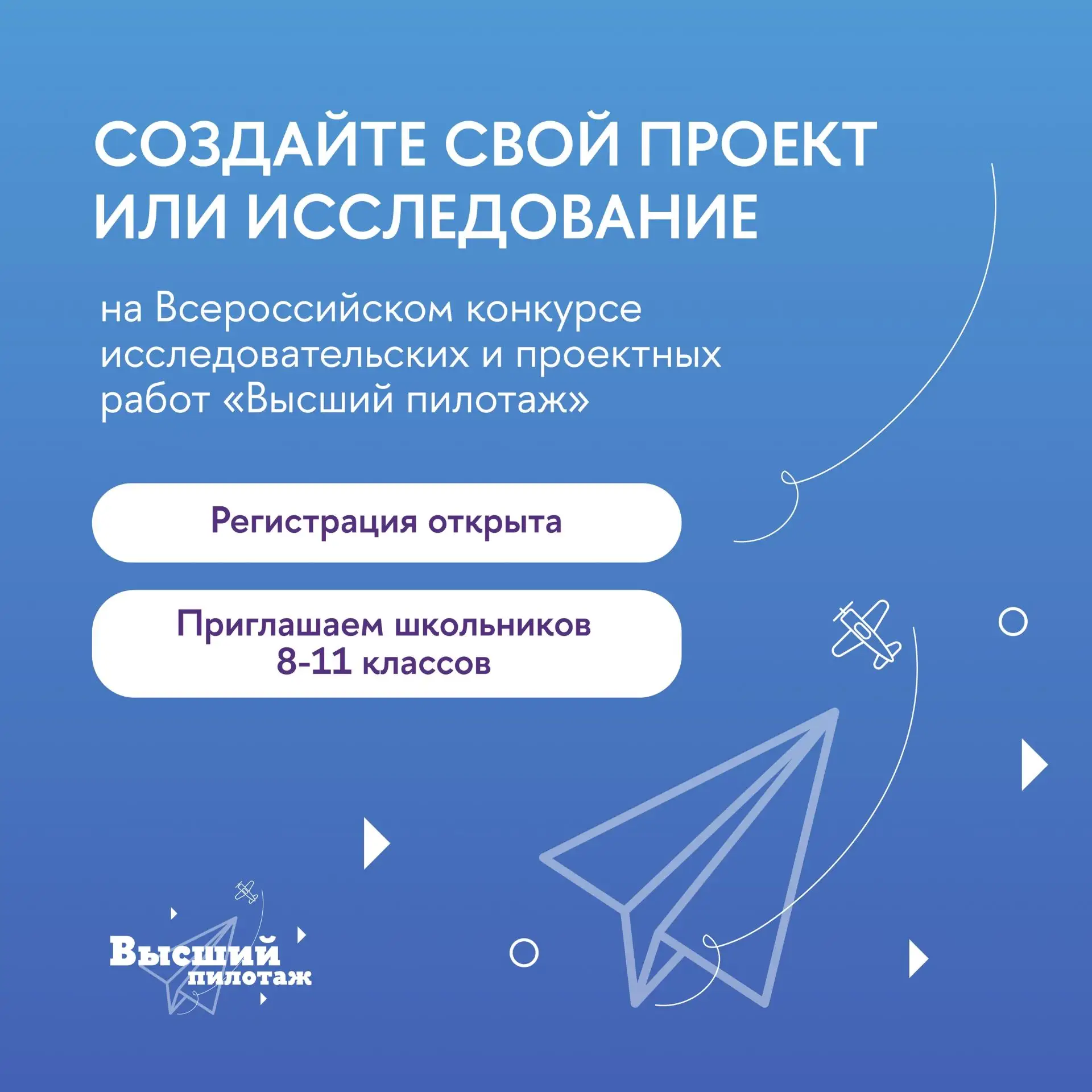 «Высший пилотаж» - это конкурс исследовательских и проектных работ для школьников 8-11 классов. Участники выбирают направление, формулируют идею, проводят исследование и защищают его перед экспертами.