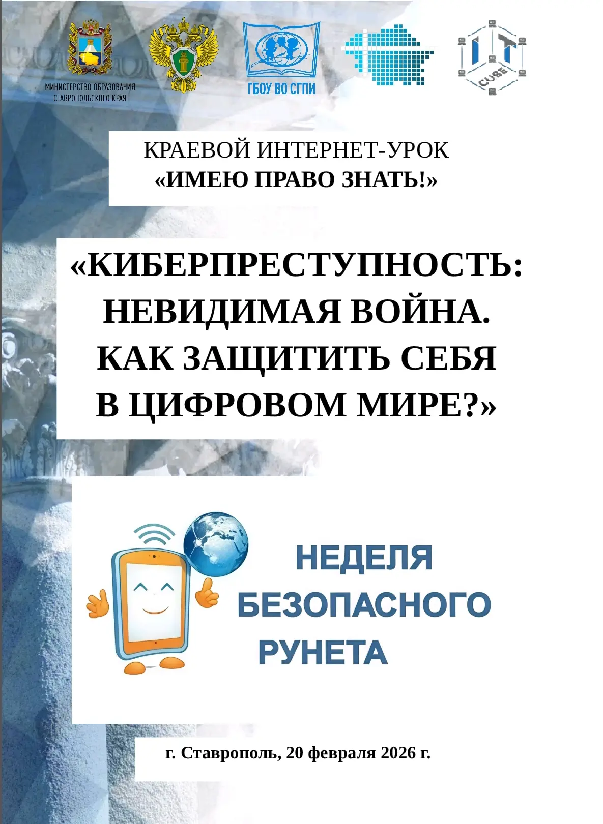 20 февраля, учащиеся 8-11 классов приняли участие в краевом интернет-уроке "Имею право знать!" по вопросу "Киберпреступность: невидимая война! Как защитить себя в цифровом мире?".