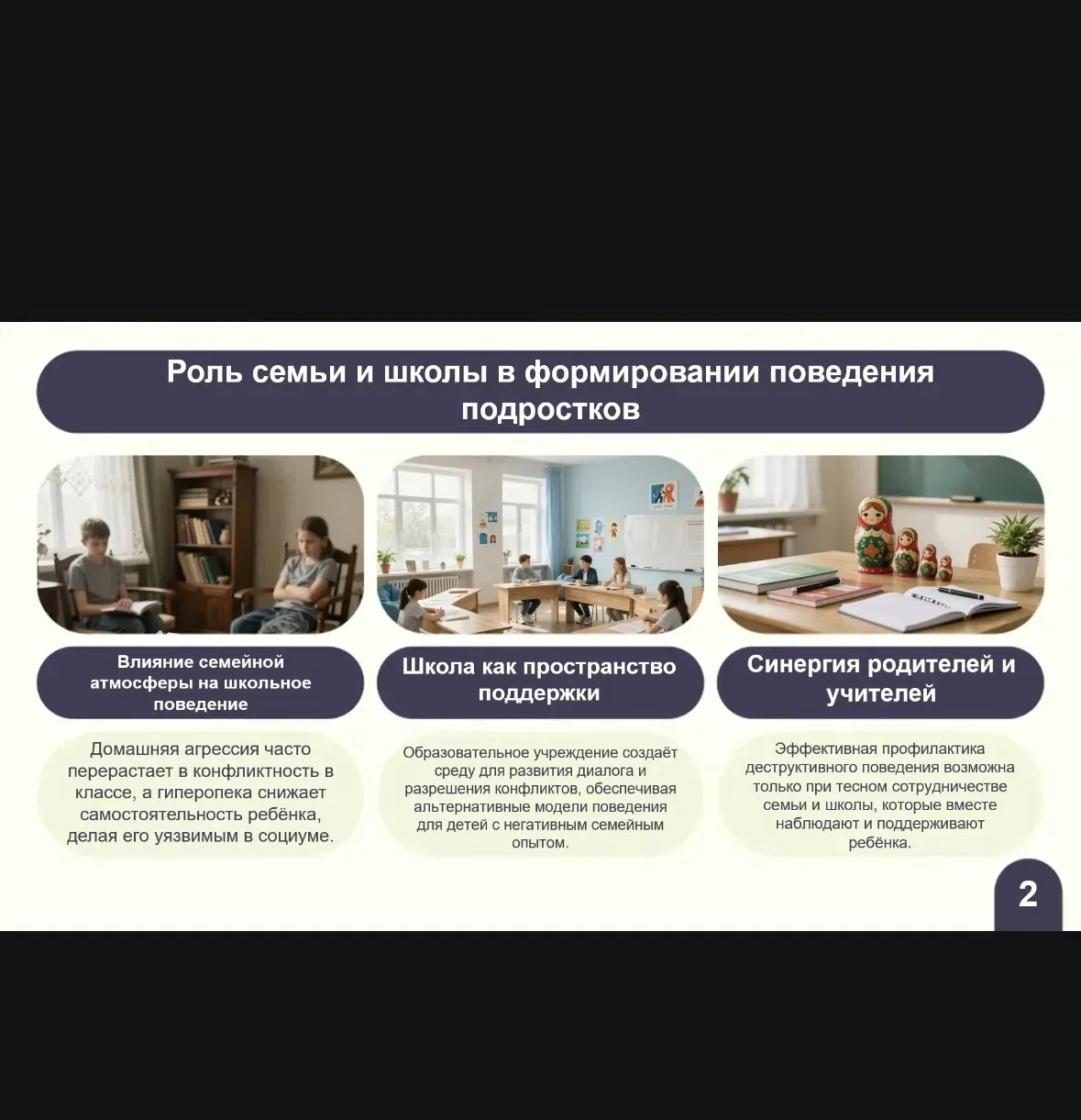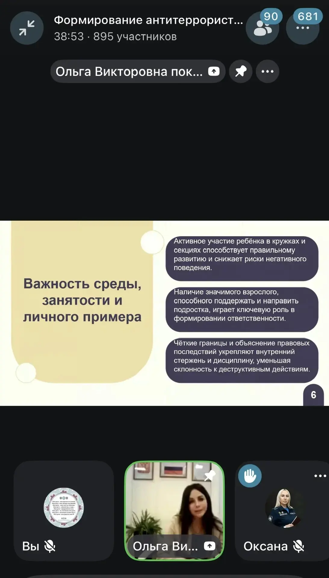 Участники обсудили взаимодействие школ с родительским сообществом, роль родительских комитетов и развитие социальной активности родителей. Был показан фильм Андрея Медведева «Предательство», после чего сотрудники МВД рассказали о методах вовлечения молодёжи в деструктивную деятельность, профилактике правонарушений и противодействии наркотрафику через интернет.