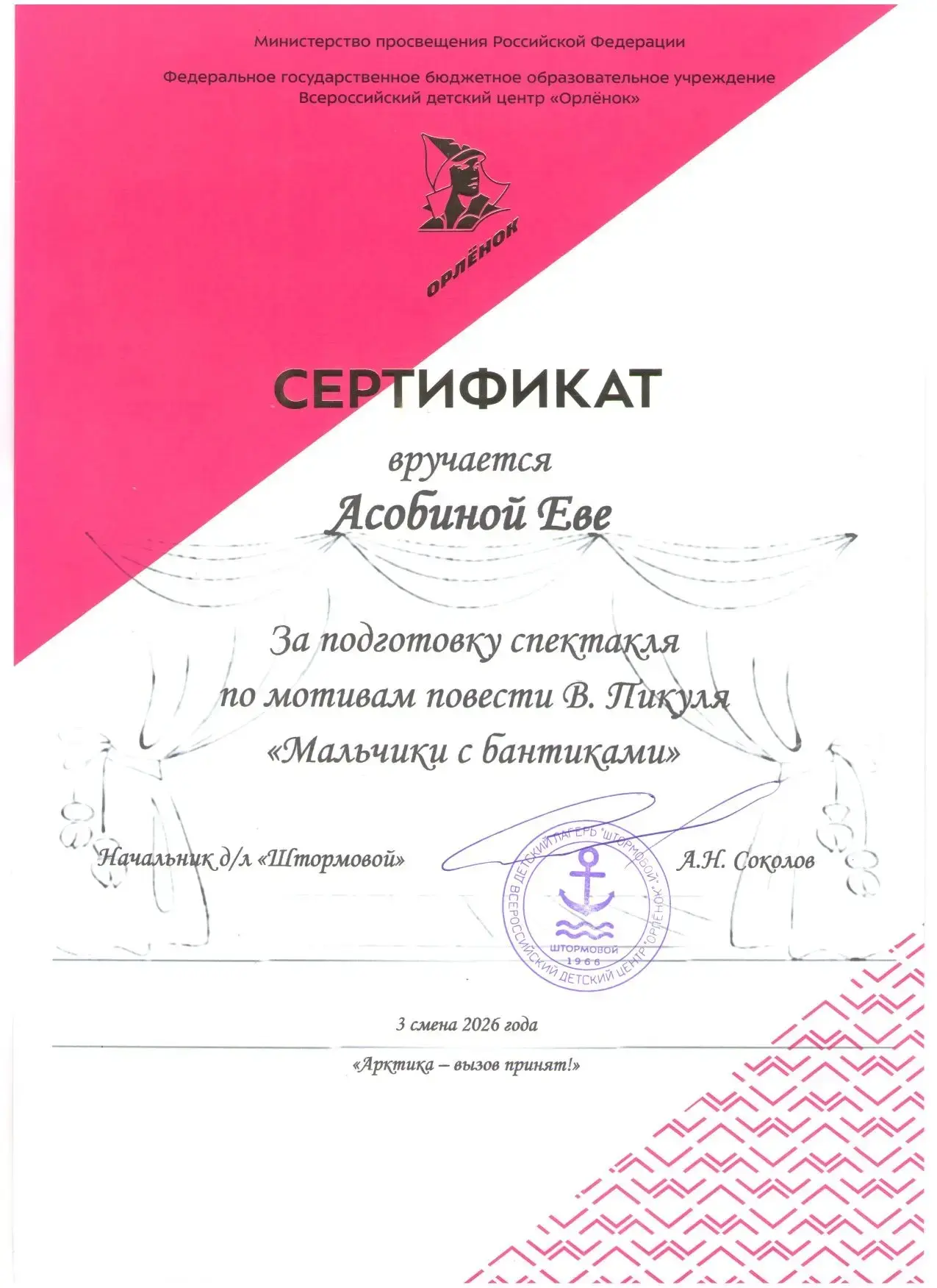 Ученица 5 А класса МБОУ СОШ №16 АСОБИНА ЕВА стала участницей 3 смены лагеря «Штормовой» ФГБОУ Всероссийского детского центра «ОРЛЁНОК»!