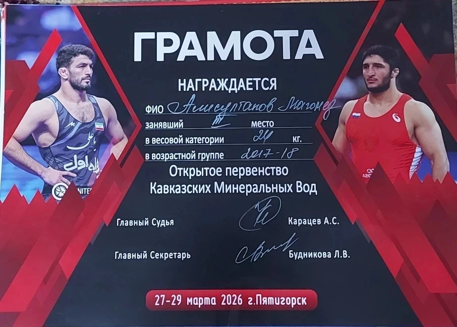 С 27 по 29 марта 2026 года в Пятигорске прошло Открытое первенство Кавказских Минеральных Вод по вольной борьбе. В этих престижных соревнованиях принял участие ученик 3 «Г» класса — Алисултанов Магомед.
