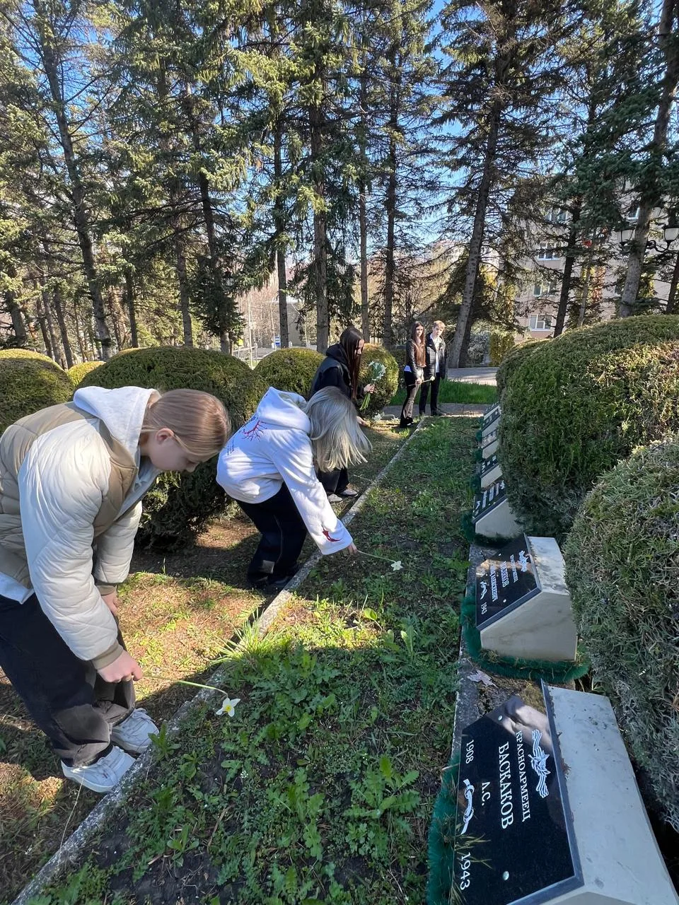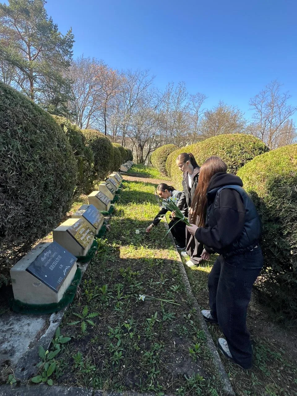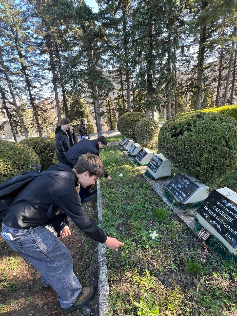 Особую значимость мероприятию придало возложение цветов к могилам солдат. Почтить память павших героев пришли ученики и педагоги гимназии. Мы помним о подвиге советского народа и о том, какой ценой досталась Великая Победа.