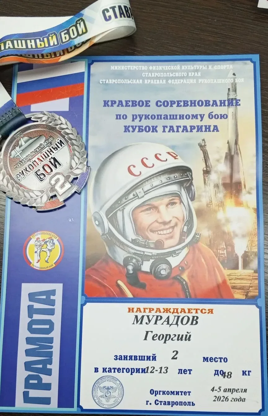 Поздравляем Георгия Мурадова с блестящим результатом на краевых соревнованиях по рукопашному бою «Кубок Гагарина» в Ставрополе (5 апреля 2026 г.) 💪