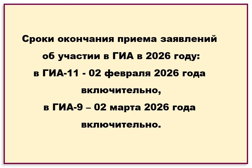 Таким образом, сроком окончания приема заявлений об участии в ГИА-11, ЕГЭ является 02 февраля 2026 года включительно, заявлений об участии в ГИА-9 – 02 марта 2026 года включительно.