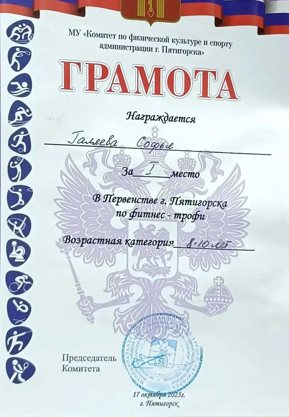 🎄🌟 Галяева Софья, ученица 4Б класса заняла первое место на Первенстве города Пятигорска по «Фитнес-профи».