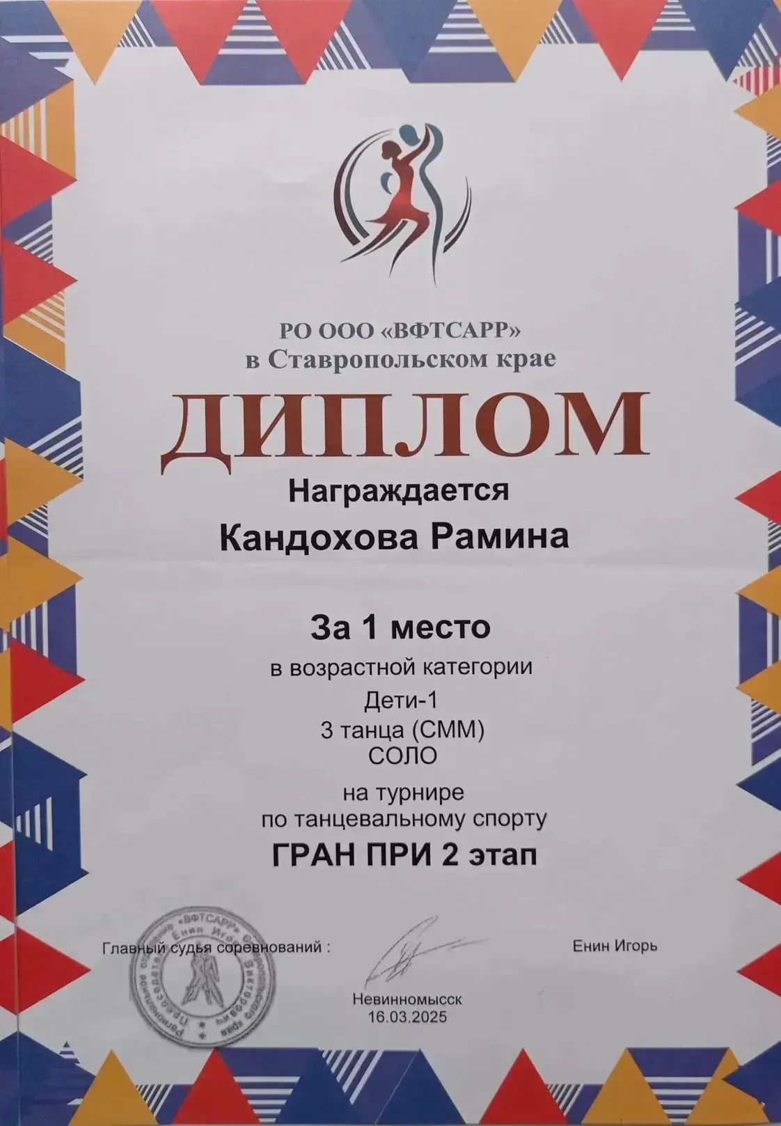 Самое главное соревнование прошло в начале марта 2025 года: Чемпионат России в Краснодаре. Первое место за танец «Аргентинум» и второе за «Мир без войны».