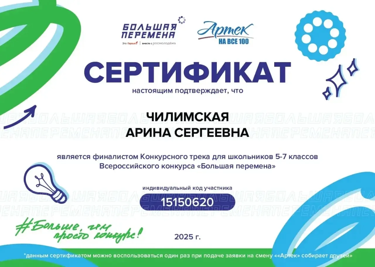 🌟 лауреатом I степени конкурса «Большая перемена» 🌟 в составе школьной команды военно-патриотической игры «Зарничка» одержала победу в лиге «Резерв» Пусть эти победы и достижения станут первыми шагами на пути к заветной цели 🎯! Желаем Арише дальнейших успехов👏👏👏!