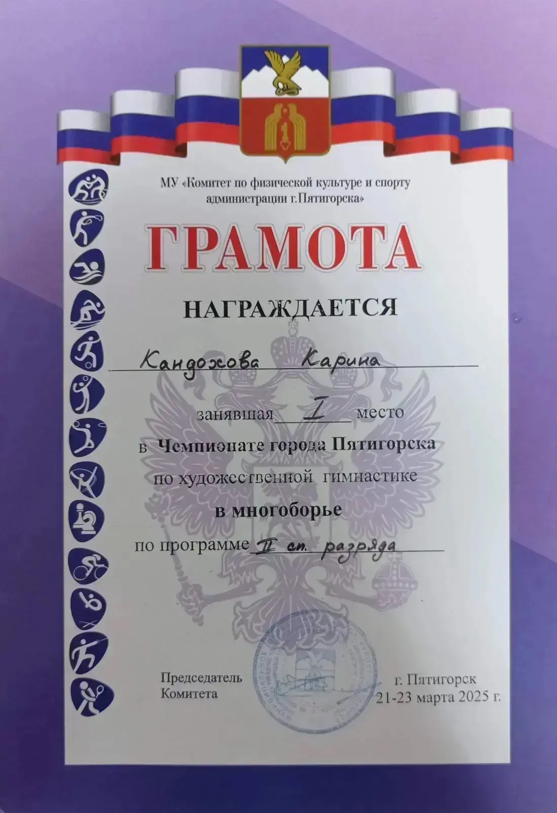 🌟🎄 Ученица 4Б класса, Кандохова Карина, заняла первое место в Чемпионате города Пятигорска по художественной гимнастике в многоборье.