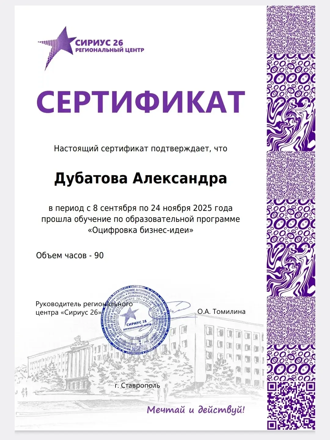 🌟🎄 Ученица 9 Б класса, член Совета учащихся школы, Александра Дубатова у уходящем году прошла отбор и обучение в Региональном центре выявления, поддержки и развития способностей и талантов детей и молодежи Ставропольского края «Сириус 26» по программе «Оцифровка бизнес-идеи». Александра активная, открытая и дружелюбная. Увлекается рукоделием, мечтает стать фельдшером, верит в чудеса💫 и Деда Мороза🎅! Гордимся Сашей и желаем ей успехов в наступающем году 🎄!